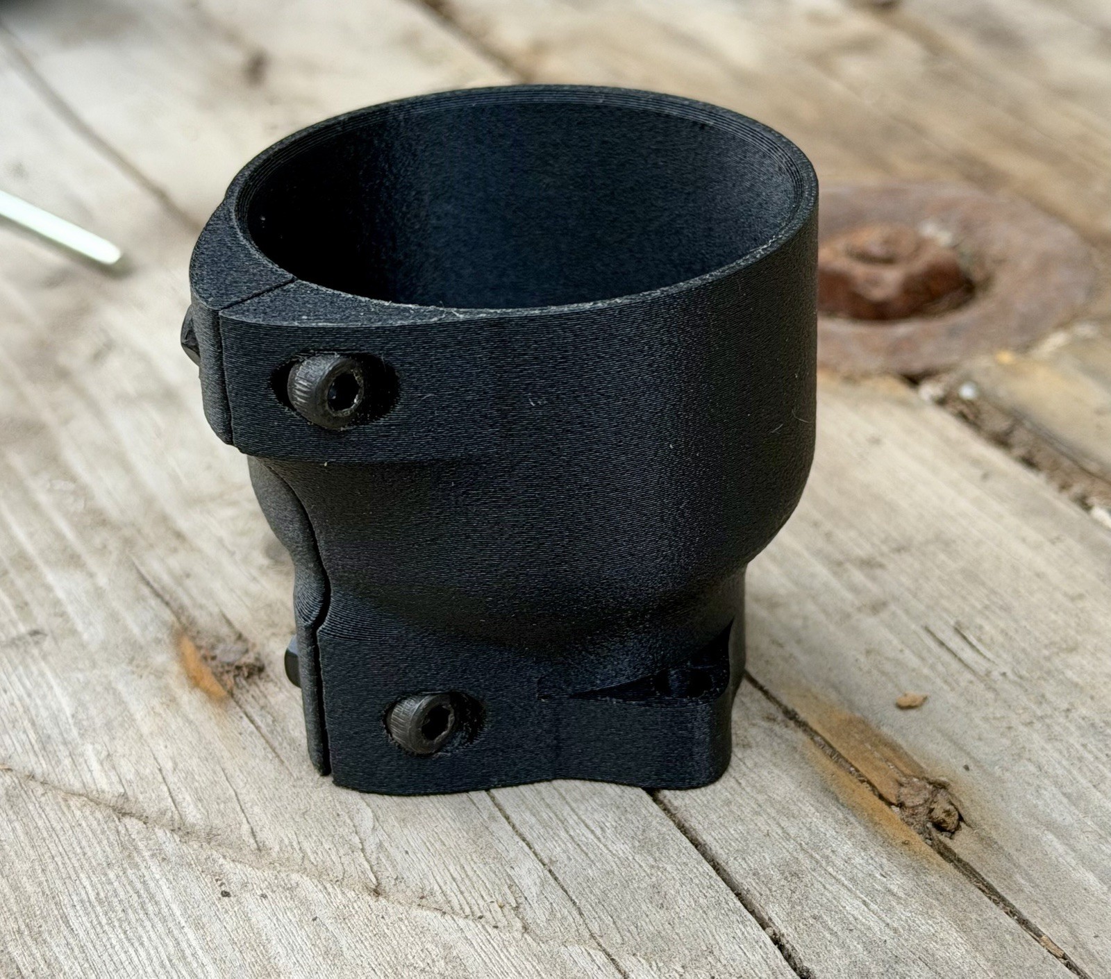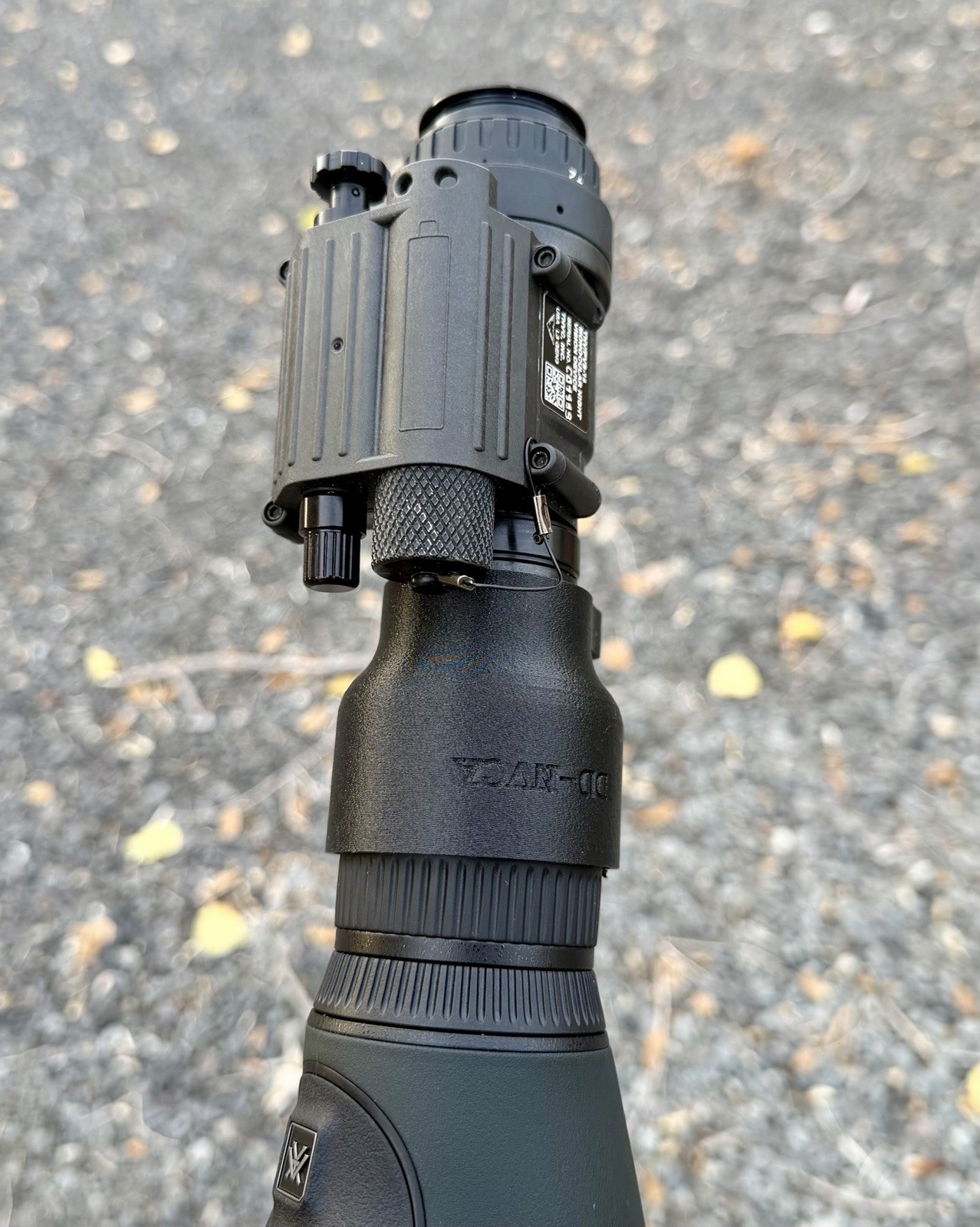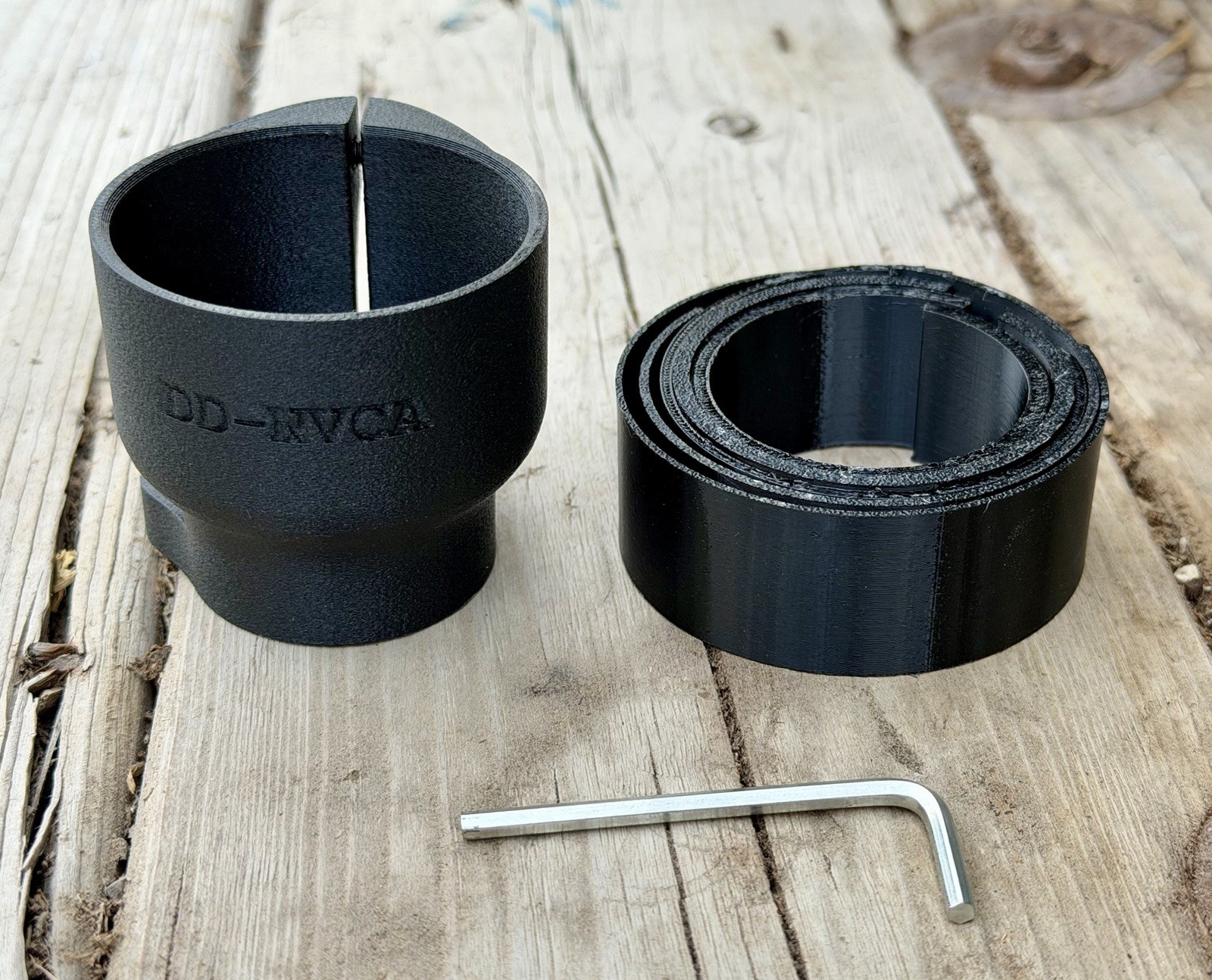 Transform your daytime spotting scope into a capable nighttime observation system with the Dynamic Designs Night Vision Coupler Assembly (NVCA). Designed specifically for the PVS-14 monocular, this precision-built adapter provides a secure, repeatable interface between your spotting scope and night vision device.The NVCA features a clamp-on design with opposing tension screws, allowing it to accommodate eyepieces up to 50mm in diameter. Included are five precision-fit shims (45mm–49mm) made from a flexible, durable polymer to ensure a snug, non-marring fit across a wide range of optics. Custom shim sizes are available upon request to fit nonstandard eyepiece diameters. The eye relief adjustment on the PVS-14 is still usable with the NVCA installed.An integrated overtravel stop prevents the PVS-14 from contacting the scope’s glass, while the built-in lanyard mounting point adds extra security during use. Though compatible with many rifle scopes, this assembly is intended primarily for spotting scopes and observation platforms. Clarity will depend on the quality of both optics.Each unit is 3D printed in-house from a high-strength, glass fiber reinforced polymer. While fully functional and durable, minor surface imperfections or layer lines may be visible due to the additive manufacturing process.Each NVCA is designed, tested, and 3D printed in-house for long-term durability and precise optical alignment. Unlike cheap import adapters, every unit includes a complete shim set for a tailored fit and features built-in safeguards like an overtravel stop and lanyard mount. You’re getting a purpose-built, field-proven solution — not a generic part.DisclaimerAny props seem in photos are not included and not for sale.Dynamic Designs is not responsible for any damage to scopes, spotting optics, or PVS-14 devices resulting from improper installation, overtightening, or misuse of this product. Always verify compatibility and clearance before use.
