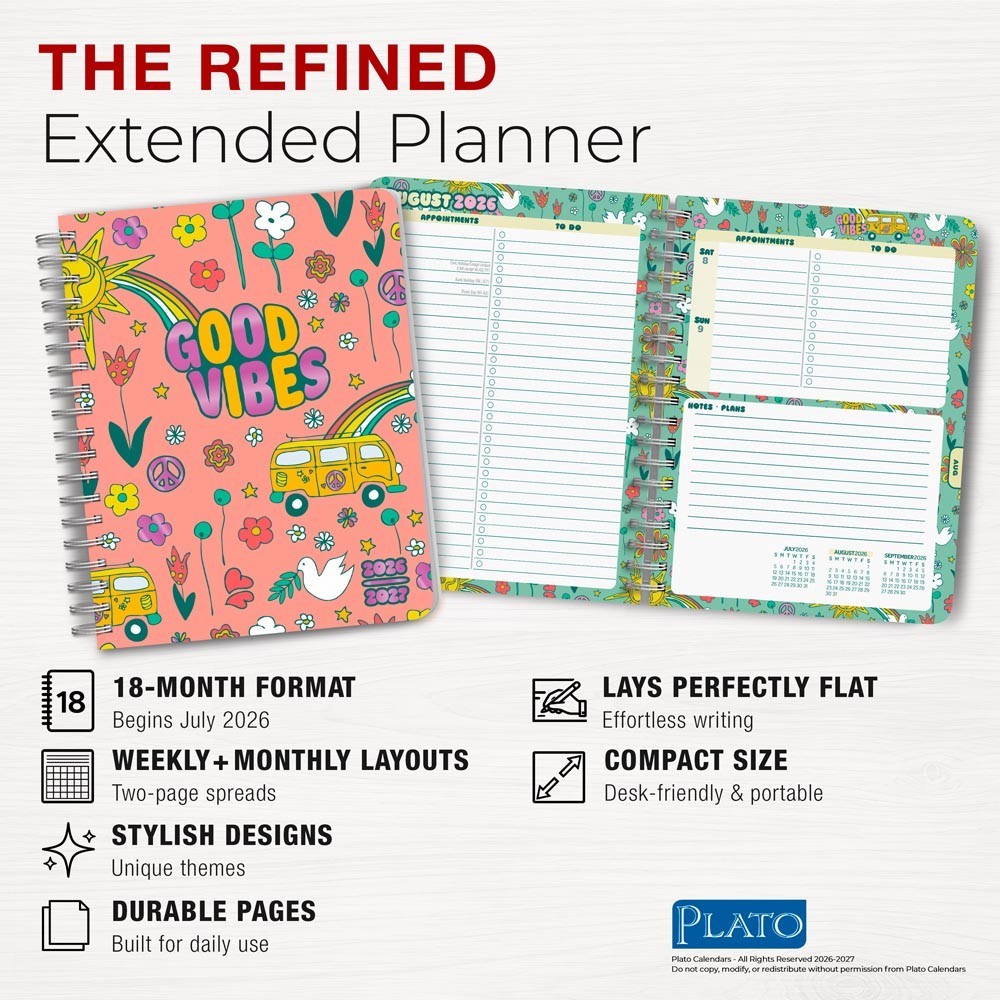 color interiors, the Plato desk planner offers more than the usual with a full 18 months' worth of two-page weekly and monthly planning spreads. This practical layout makes daily, weekly, and monthly planning a cinch, while offering additional pages to jot down monthly goals, weekly to-do lists, daily appointments - and more! Sturdy covers are adorned with eye-catching foil highlights and smooth, radius corners. Wire bound and easy to carry in a purse, backpack, or briefcase.Ample Room – Each day includes plenty of space to accommodate multiple entries for planning, notes, and appointments. Two pages per week, and features an expansive, two-page monthly calendar for each monthAesthetic Appeal – All desk planners have unique and visually appealing designsDurable Construction – Thick, high-quality pages help to prevent wear and tear throughout the yearAccessible Layout – Opens and lies flat for ease of writing and readingPortability – Great to keep at your desk with plenty of room inside to keep important notes; also compact enough to take with you wherever you goSpecifications – 18 months (July 2026–December 2027); 6" x 7.75" (closed); 12" x 7.75" (opened); 176 pagesPlato Earth-Friendly – Manufactured with sustainable materials, including Forest Stewardship Council®-certified paper and soy inkAbundant Gift Options – Plato has a variety of calendars featuring popular subjects and themes in various formats to keep you organized