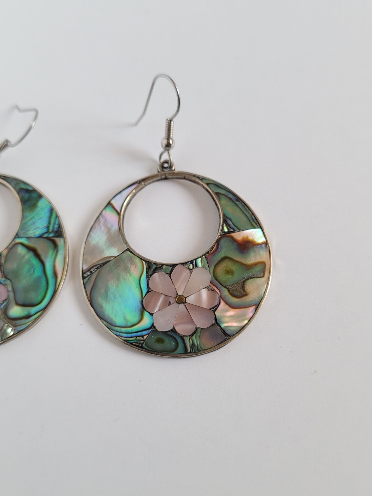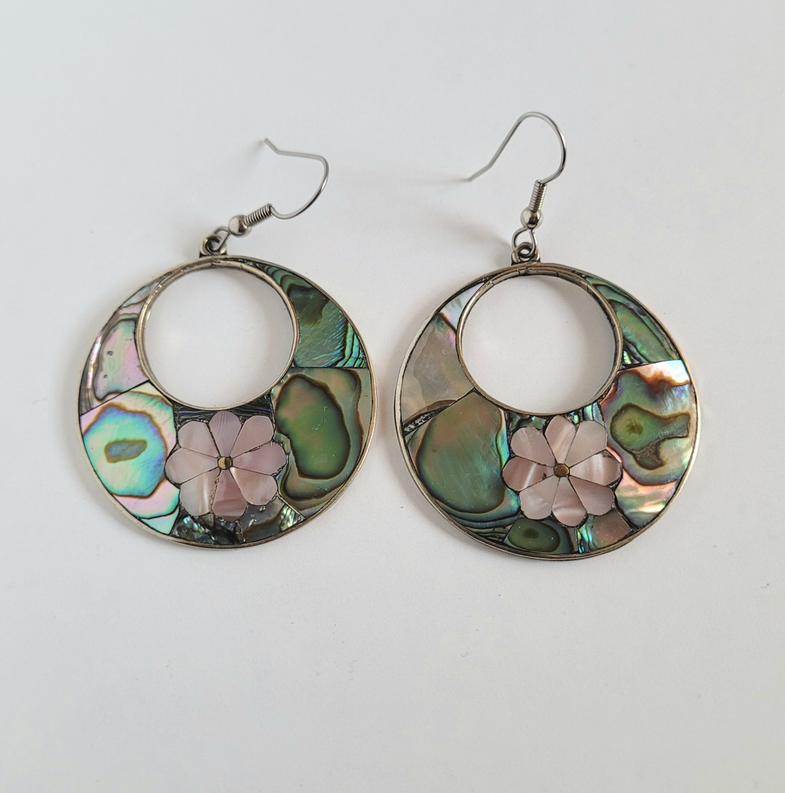 Vintage Alpaca Mexico Abalone Shell Flower Design Hoop Circle Dangle Earrings