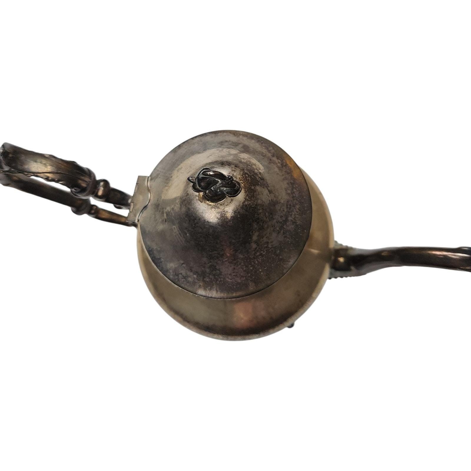Vintage silver-plated teapot made by the Birmingham Silver Company (BSC). The teapot features an ornate, traditional style with a bulbous body, a scrolling handle, and four ornate feet. It is made of silver plate on a copper base, and the design includes a hinged lid topped with a decorative finial.The patina has been kept for collectors who love the vintage look, but it can be polished to a beautiful shine if preferred.11 inches tall12 inches wide - spout to handle3 lbs.