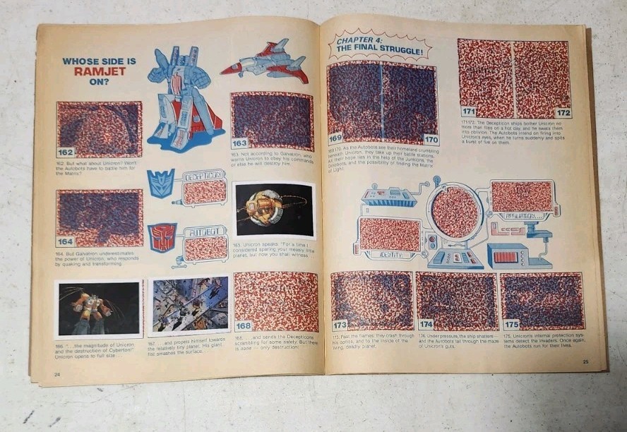 Vintage 1986 Transformers The Movie Sticker Book made by Diamond. Has the decoder and checklist. Most of the pages have some stickers but it is not a complete set. Has chips missing along the edges and general wear. No torn or written on pages that I saw. Please view the pictures.
