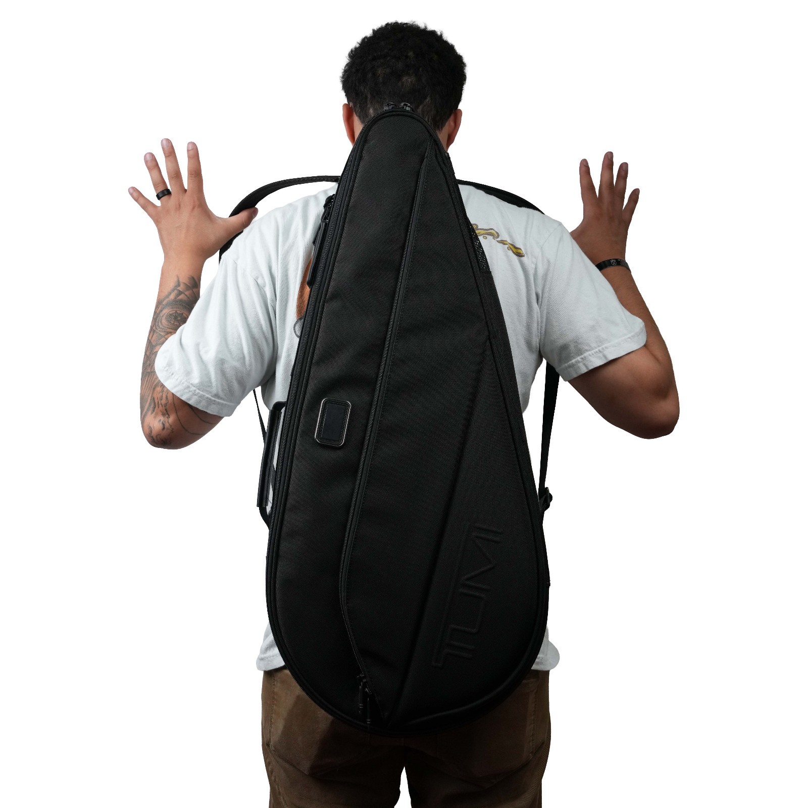 Designed for the everyday player, the Tennis Racket Bag holds up to two rackets and balls with space for clothes and a water bottle. Stand out on and off the court with custom embroidery. Exterior Zip entry to main compartmentWebbing top carry handles with leather wrapFront zip pocketAir-ventMagnetic luggage tagBack zip pocket with hideaway hook to attach to fenceMagnetic shoulder strap that converts into backpack strapsEmbroidery capabilities on front pocketAdd-a-Bag sleeveMonogram patchDimensions:12.5" X 29.0" X 2.5" Interior Zip pocketMedia pocketMesh tennis ball pocket( fits up to 3 balls)Split main compartment holds 2 racketsKey leashTUMI Tracer®