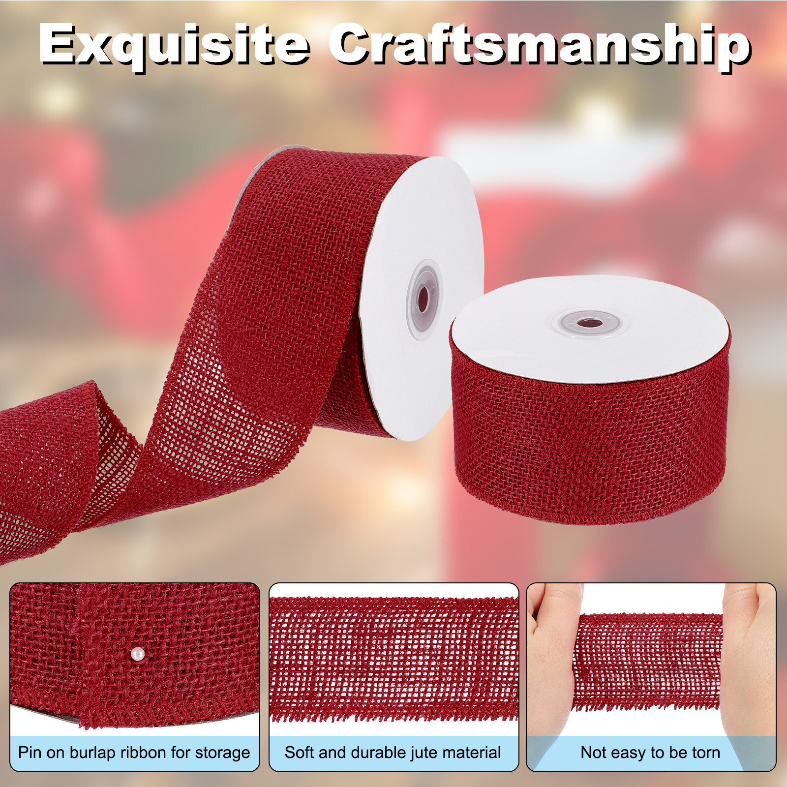 color to fade. Finally, keep the ribbon away from open heat sources. 2.5" Wide 10 Yards Burlap Fabric Ribbon Jute Crafts Roll Wrapping Red The burlap ribbon is perfect for a variety of occasions, including Christmas celebrations, weddings, parties, and home decoration. It can be used to decorate christmas trees, tables, chairs, vases, bouquets, photo frames, and more. The natural look of the ribbon adds a cozy and warm feel to any space.SpecificationColor: RedMaterial: JuteSize:2.5 inch x 10 Yard / 63.5mmx9.1m (W*L)Packing List: 1 x Burlap Fabric RibbonAdvantageThe burlap ribbon is flexible yet stiff enough to maintain its shape, making it an excellent choice for burlap trim and wreath making supplies. The natural jute fabric adds a rustic touch to any project, and the ribbon is durable and long-lasting.InstructionTo use the Burlap Ribbon, simply unroll the desired length and cut with scissors. The ribbon can be tied, twisted, or wrapped around objects to add a decorative touch. It can also be used to create bows or other embellishments.Note: When using the Burlap Ribbon, be careful not to get it wet, as it may cause the fabric to shrink. Additionally, avoid exposing the ribbon to direct sunlight for extended periods, as this may cause the