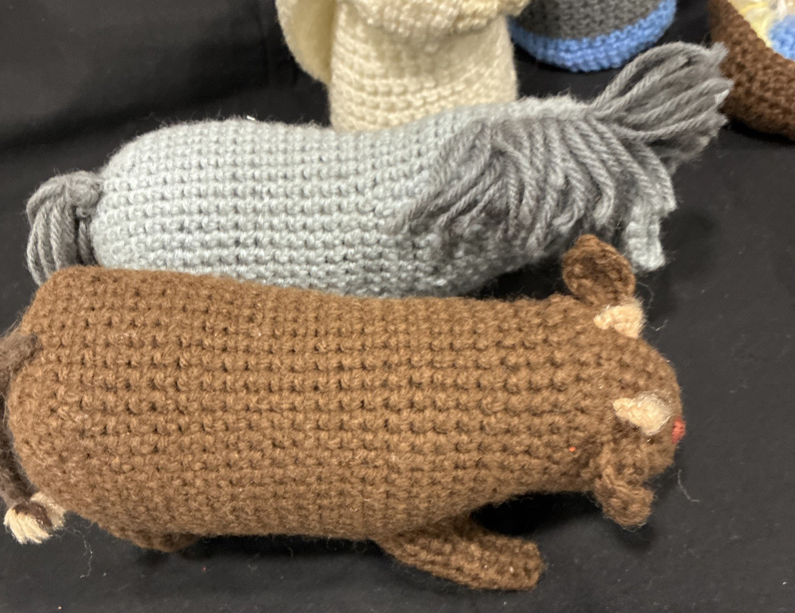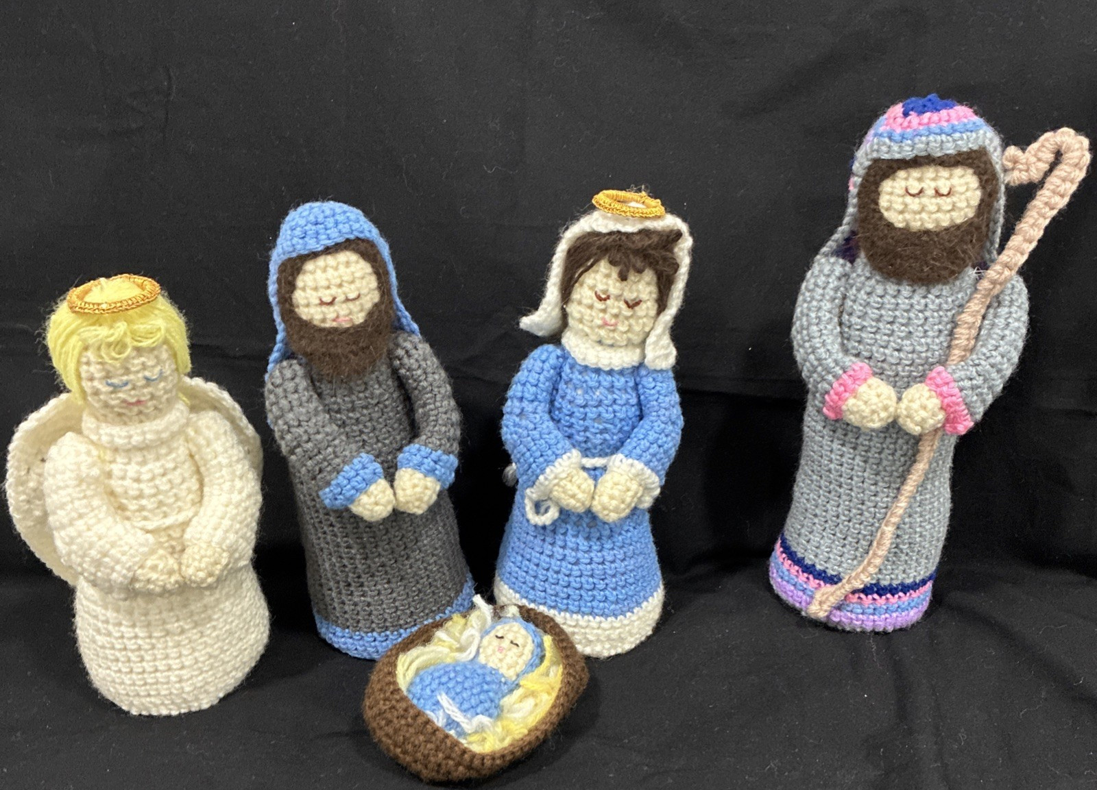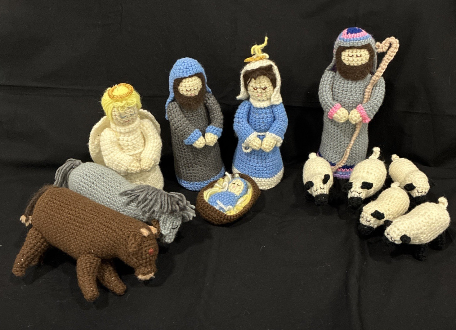 VINTAGE HANDMADE Christmas Nativity Crocheted. Included are: Mary, Joseph, Baby Jesus, Angel, Shepherd, 5 sheep (listed as lambs in the directions), a gray donkey and brown cow. Also included are the original crochet instructions that are from McCall's winter 1978 Issue. This crocheted Nativity Set was made by my mom. As you can see on the instruction sheet she dated it 5-6-1979, which I can assume that is when she started this set. She would work on these and as she’d finish one, she’d put in a plastic box and continue to the next. Never used and has been stored for many years. She is now 95 years old and has not crocheted for many, many years. See photos for details of condition of the crocheted items as well as the instruction sheet.