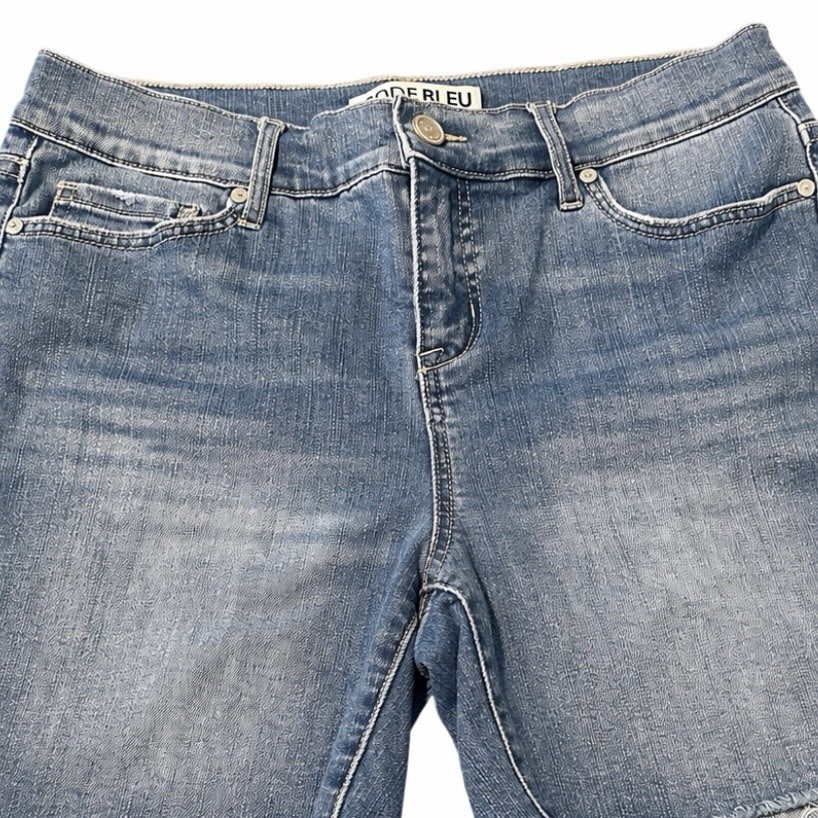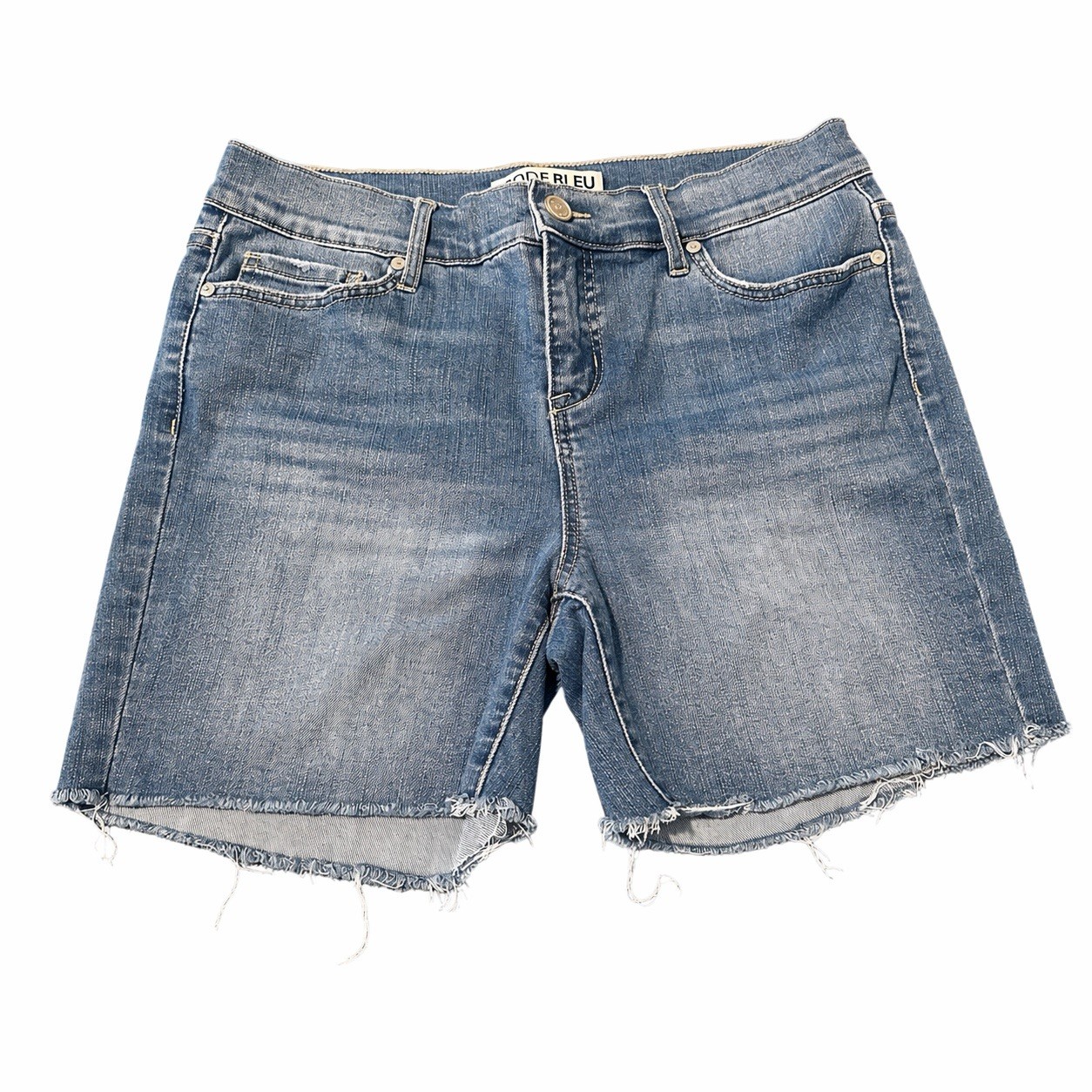 Upgrade your warm-weather wardrobe with these stylish Code Bleu Chelsea denim shorts. Designed for comfort and everyday wear, these shorts feature a flattering mid-rise fit with a classic 5-pocket style and trendy raw hem for a casual, laid-back look. Zip Fly with button closure. 59% Cotton, 28% Polyester, 12% Viscose, 1% Spandex.Approximate measurements:Full length 15” inches long from waist to hem.Inseam 5” inches long.Waist 30” inches wide.Rise 10” inches long.Size: Women’s 4Color: Medium Wash BlueCondition: Pre-owned in good condition with normal wear.