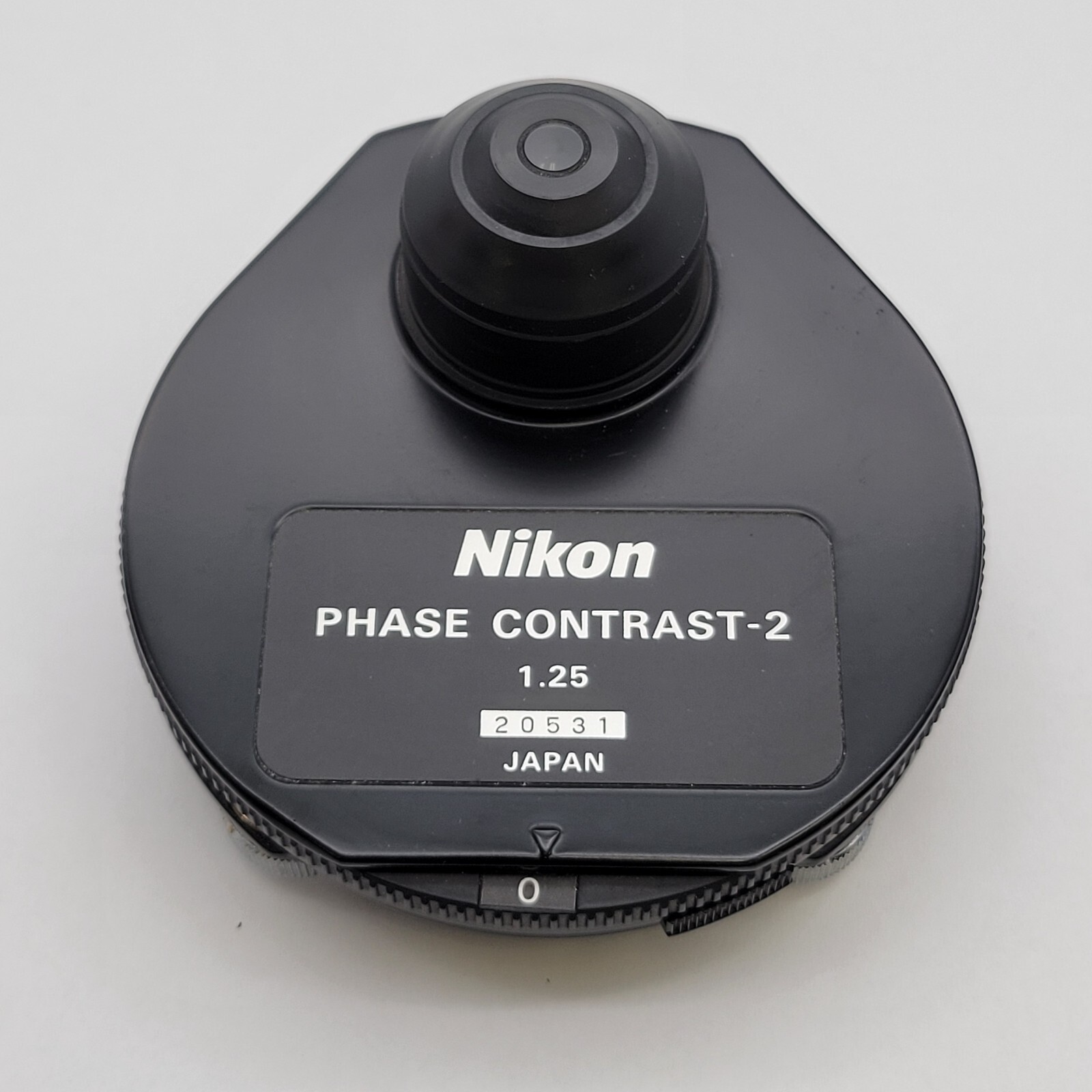 Nikon Microscope Condenser Phase Contrast-2 1.25na6 Position Turret (0, DF, Ph1, Ph2, Ph3, Ph4)All rings are intact and in good condition.Diaphragm adjusts properly.Turret rotates properly with click stops.Centering knobs adjust properly.For Labophot/Optiphot/Alphaphot models.This product is offered by Microscope Marketplace, a Munday Scientific Company.