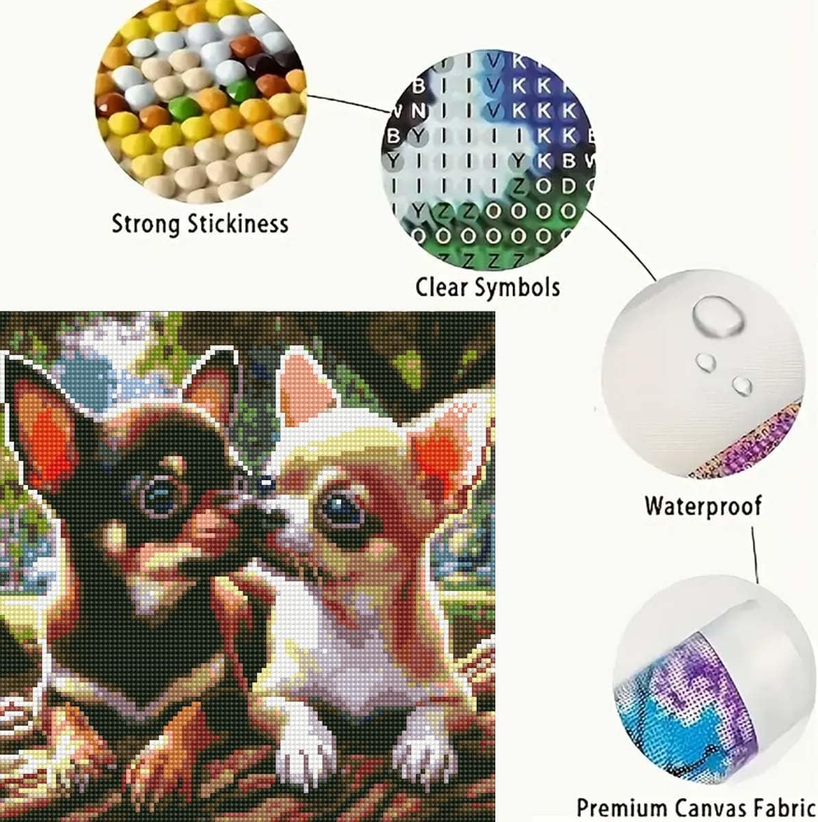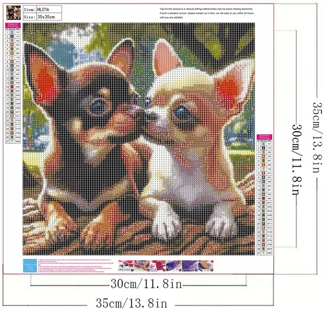 body html h3 p h2 div Animals Diamond Art Kits for Adults,Chihuahuas 13.8 x inches, ChihuahuasDiamond Painting Kits Includes Tools: 1:1pcsX diamond HD canvas 2:1pcsX diamond pen 3:1pcsX pen holder 4:1pcsX diamond tray 5:1pcsX solid glue 6:10pcs X plastic bag Enough Colorful round diamonds (offer extra 30% diamond) DIY Diamond Painting For Adults Beginners Steps: 1:peel off the adhesive covering the pre-printed canvas. 2:ldentify a symbol you like to work on. 3:locate the symbol and corresponding