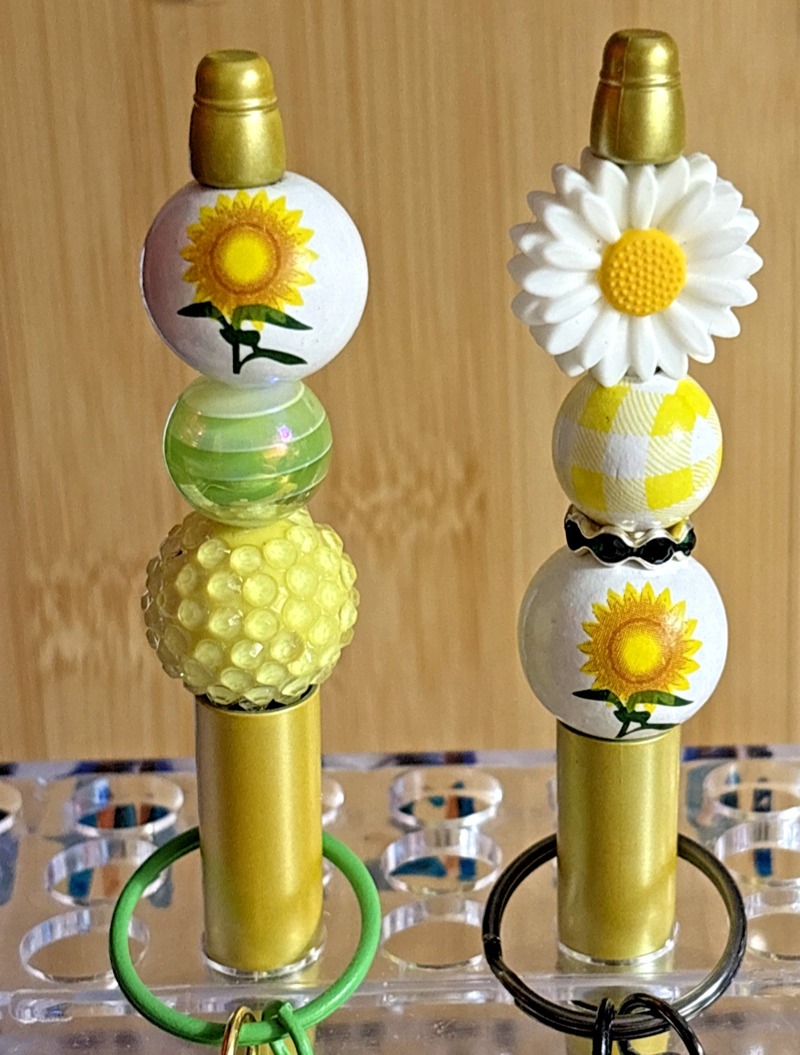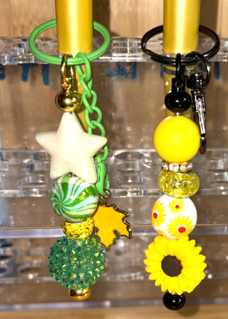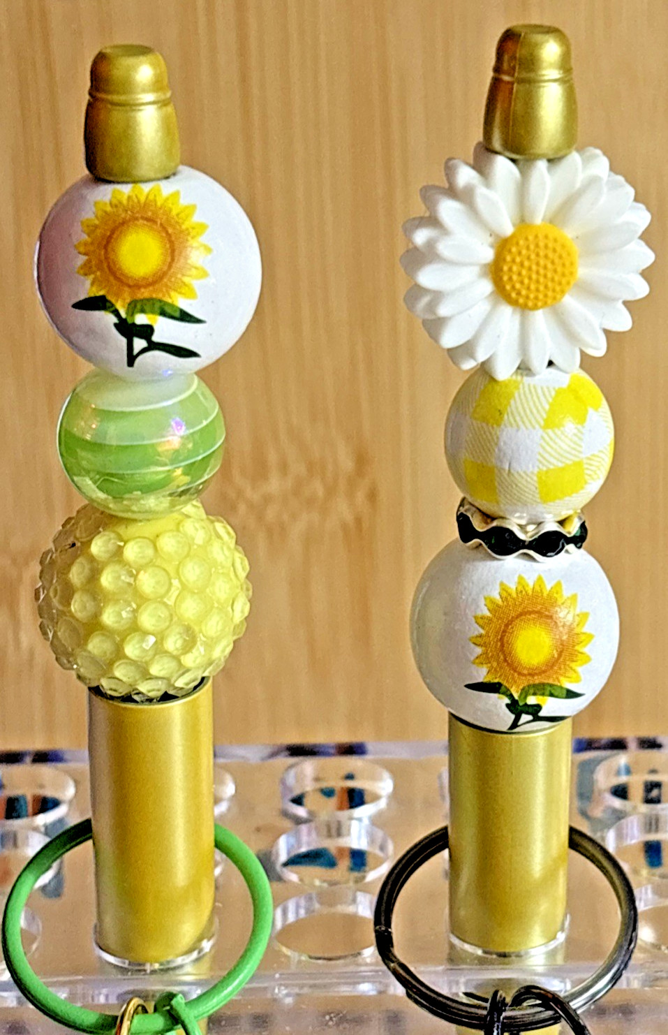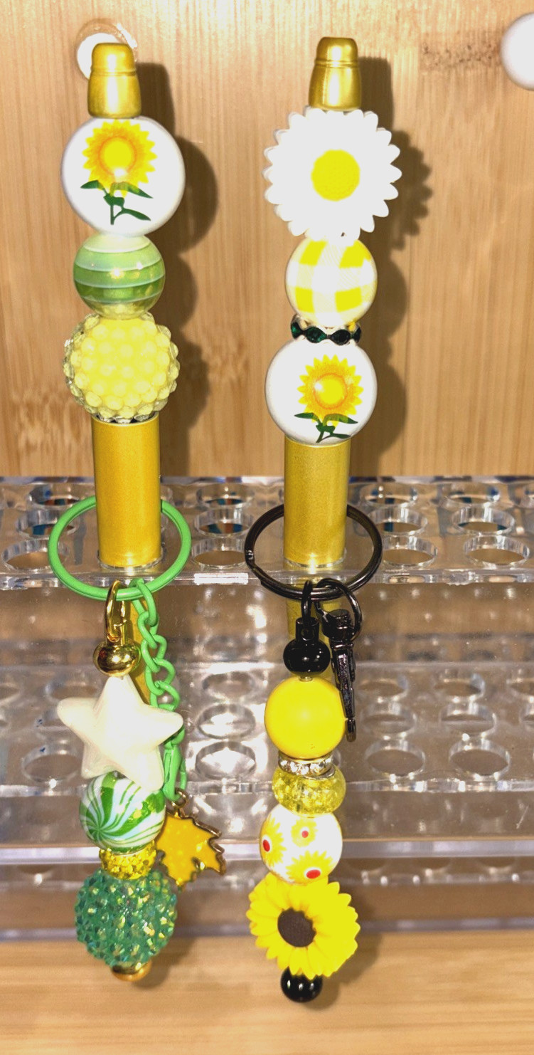 2 HAND MADE BEAD PENS & 2 BEAD KEY CHAINS-& INK REFILL each- SUNFLOWER