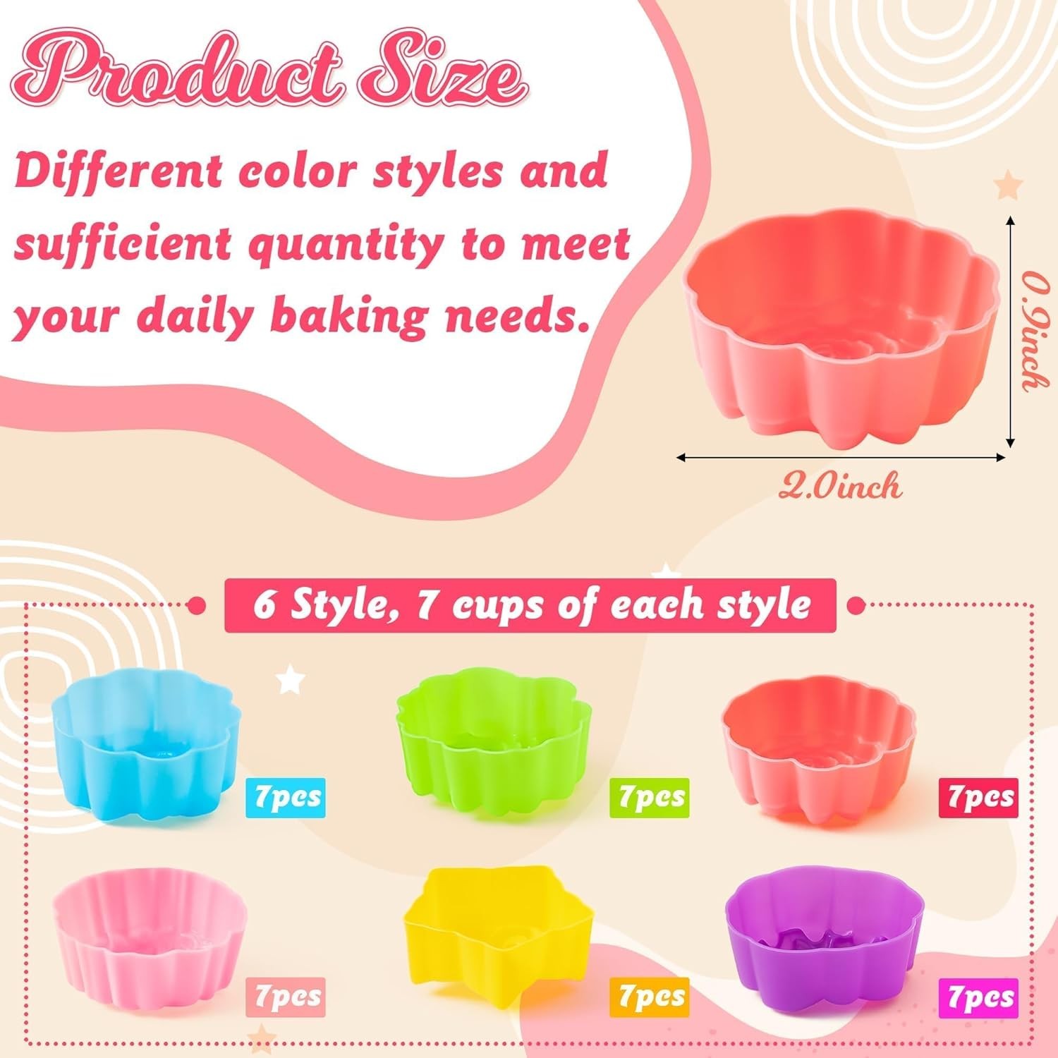 size for baking cups for everyday desserts, donuts, party snacks, afternoon tea cake baking, and more! Also, perfect for use in bento boxes of all sizes as lunch box dividers. PREMIUM SILICONE MATERIALS: Our multiple shapes cake molds are made of food-grade silicone, BPA-free, odorless, do not fade easily, and can support your long-term use. Also, Our cup molds are heat resistant and can be safely used in ovens, microwaves, and refrigerators. EASY CLEANING: No need to worry about cleaning. Our silicone molds are non-stick, easy to peel and clean, and can even be cleaned simply with soap and water, as well as being dishwasher safe for simple and convenient use. WIDELY USES: Perfect for preparing muffins, mousses, breads, puddings, tarts, jellies, mixes, brownies, chocolates, custards, soaps, fat bombs, and more, our silicone cake baking cups can help you create more beautiful and impressive cakes. Also, use our cake cups as dividers in your bento box to put in different foods like fruits, cakes, vegetables, and more to create a healthier lunch for you! Product We offer a 30-Day Return Policy on items which you are not completely satisfied with. You have the option for a full-refund or an exchange of the item. No returns are available on items shipped outside of the US. Shipping We offer Free Shipping to the US and ship within 2 business days of payment, usually sooner. We use UPS express shipping. That's why your products are usually delivered within 3 days. Contact We try our very best to make sure every customer is completely satisfied. If there's a problem, message us! We're happy to help. 24/7 live chat available.