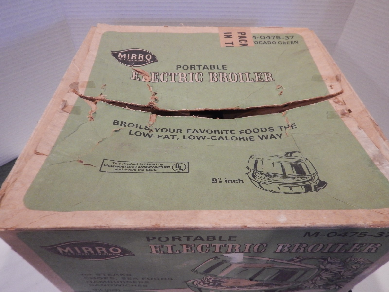 A vintage Mirro M-0475-37 portable electric broiler in the avacado green color. It has the original box also, but the box has a lot of wear.. The unit is in very nice condition. A little baked on goodness by the element attachment spot. I tested it and it heats up very quickly!! A great item to use, add to a collection, use as a prop, etc. There are no instructions, so I photoed how the element attaches. A simple slide of the metal piece. Overall in very nice condition.If you see a small gray dot near the center of a photo, that is from my camera and is not on the item. Please examine all photos. Thank you for your interest.