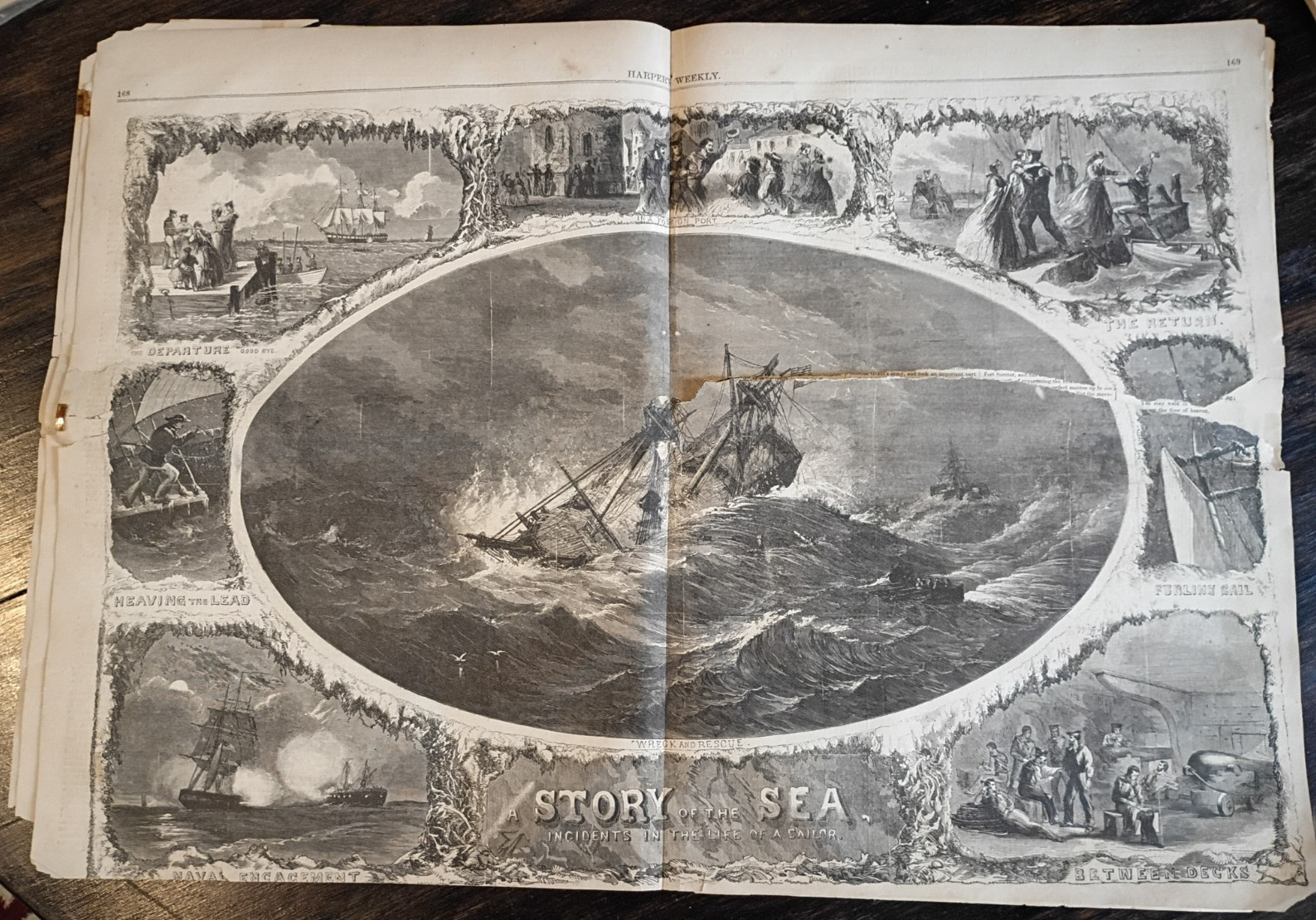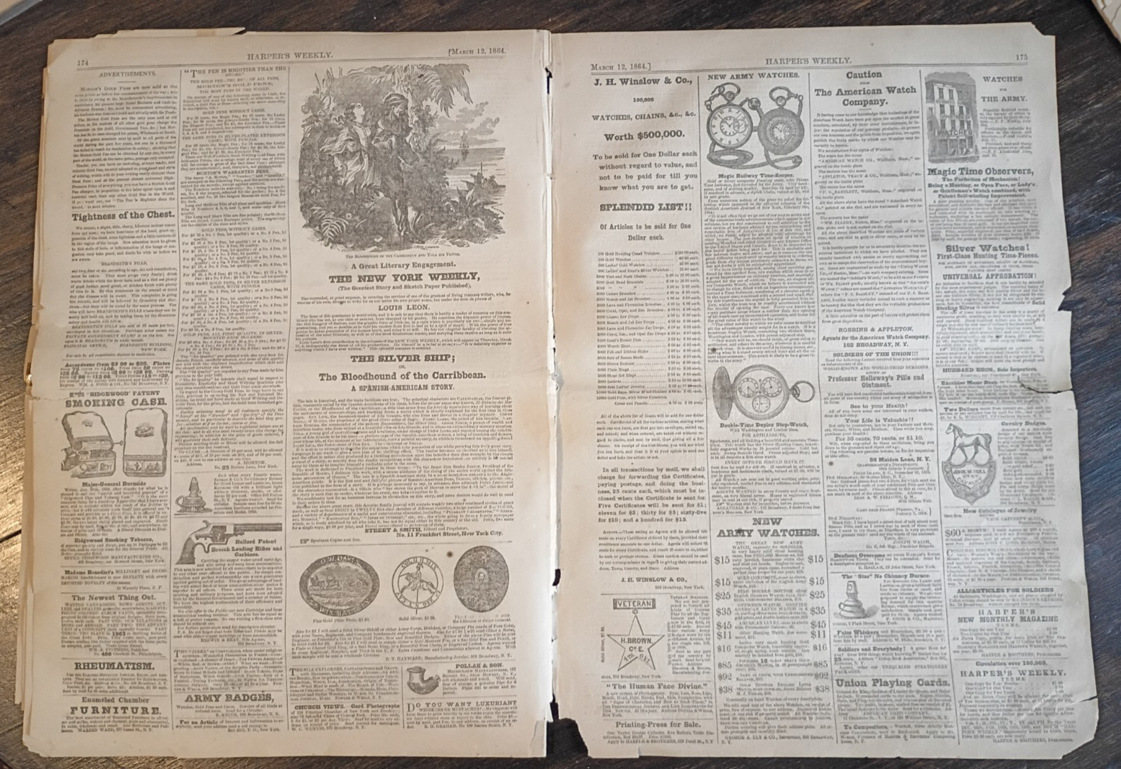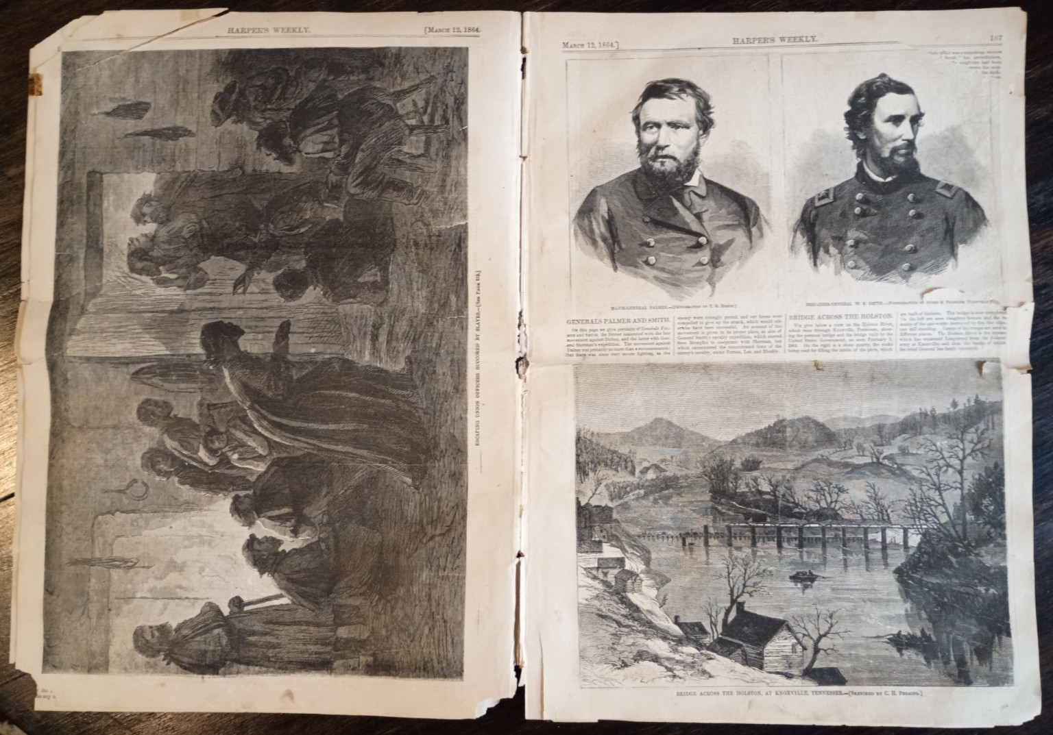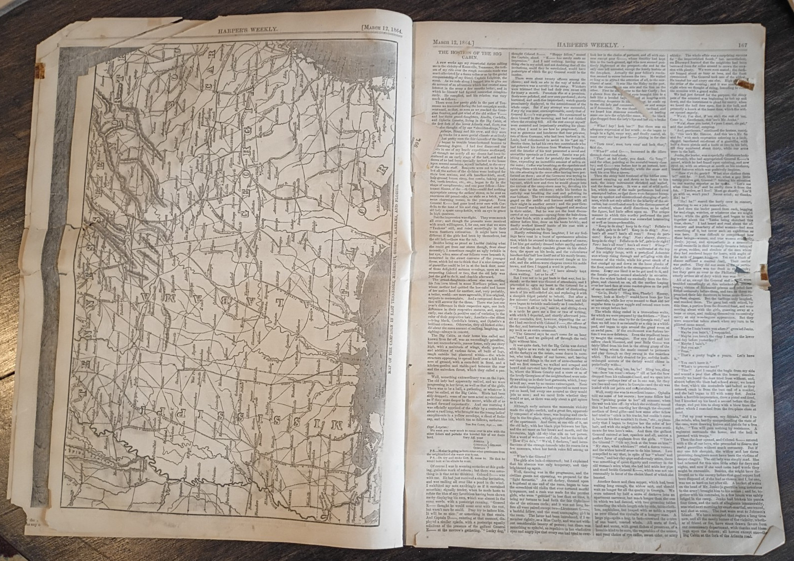 March 12, 1864 Harper's Weekly. 12 pages (missing 4 pages) in poor condition with significant tears throughout, frayed edges and some toning/foxing.