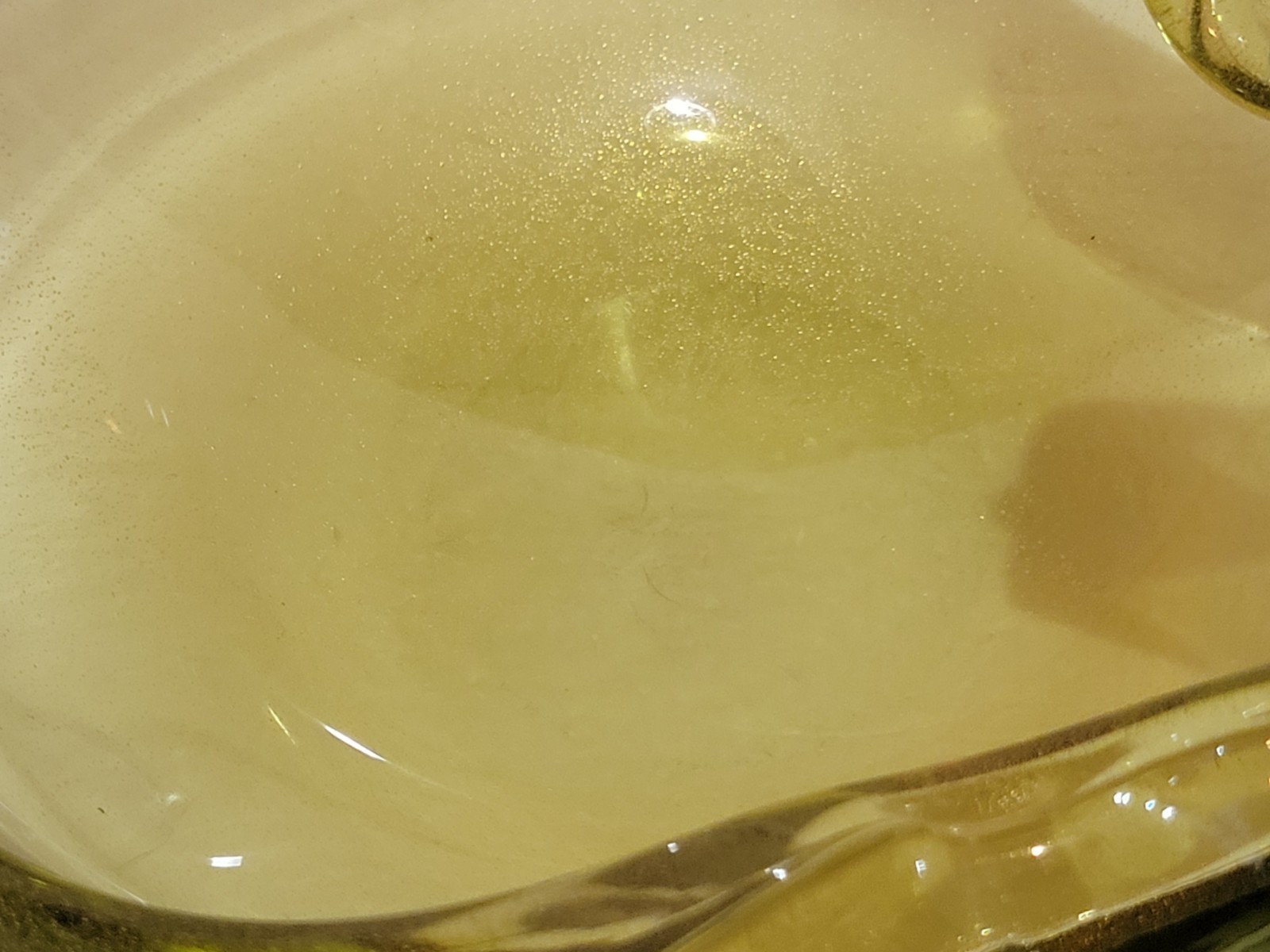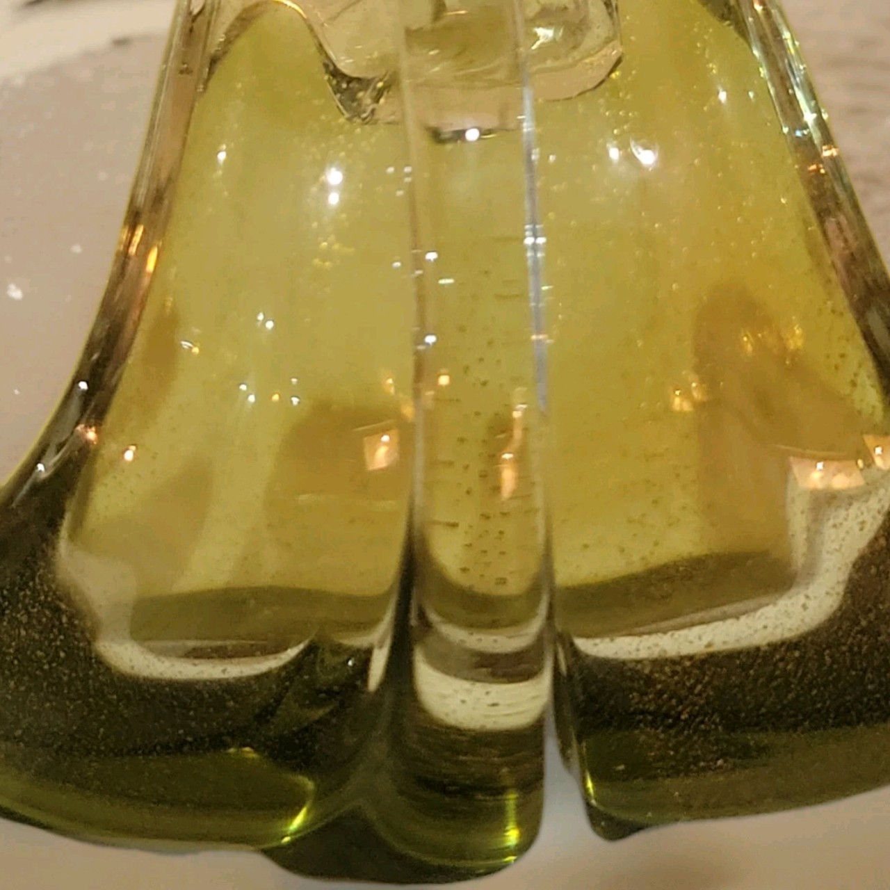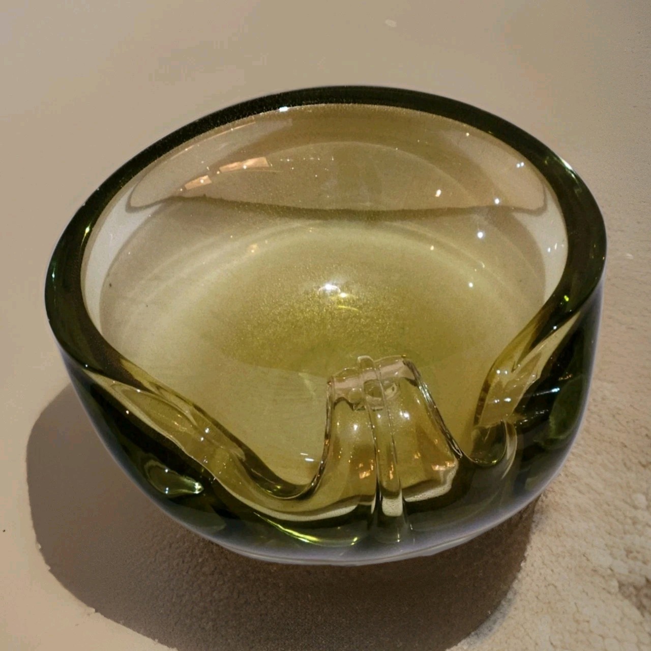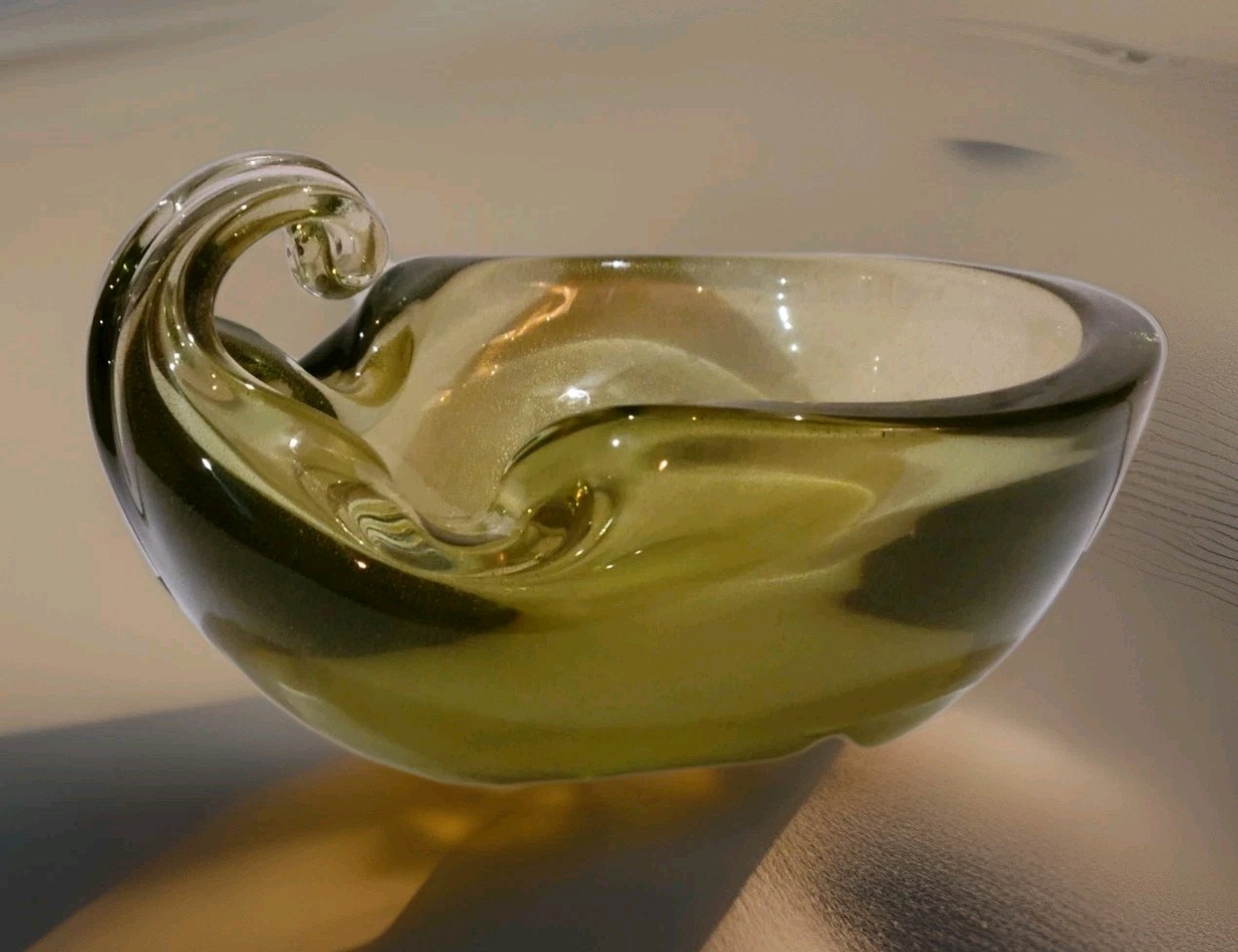 The MCM-Murano Archimede Seguso art glass bowl is a stunning piece handmade in Italy during the 1960s. This large bowl features heavy gold flakes, giving it an elegant and luxurious look. The intricate design and craftsmanship make it a unique and collectible item for vintage and retro art enthusiasts. Made with the highest quality materials, this bowl adds a touch of sophistication to any space. I'm happy to answer any questions you may have or if more photos are needed. Thank you for your interest!