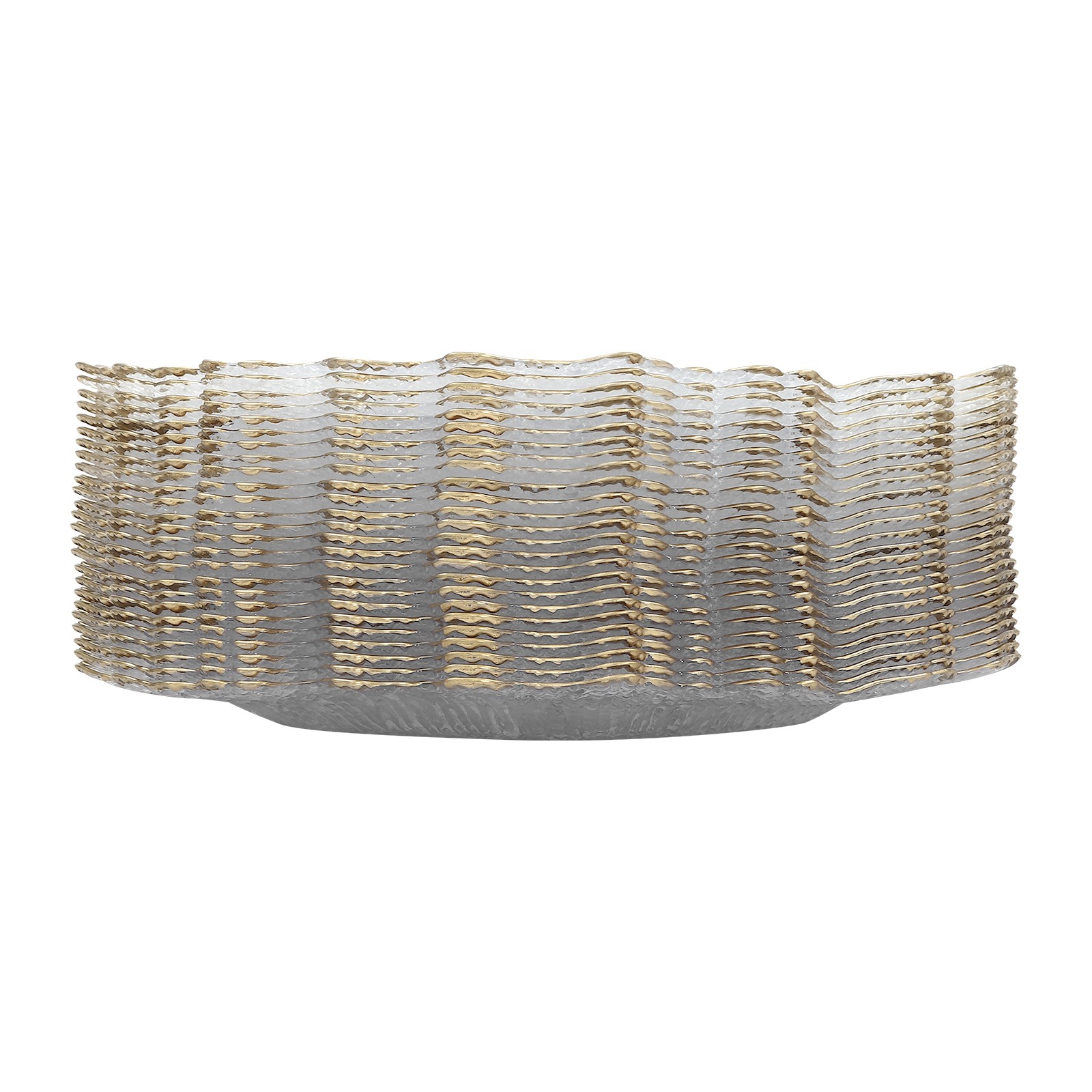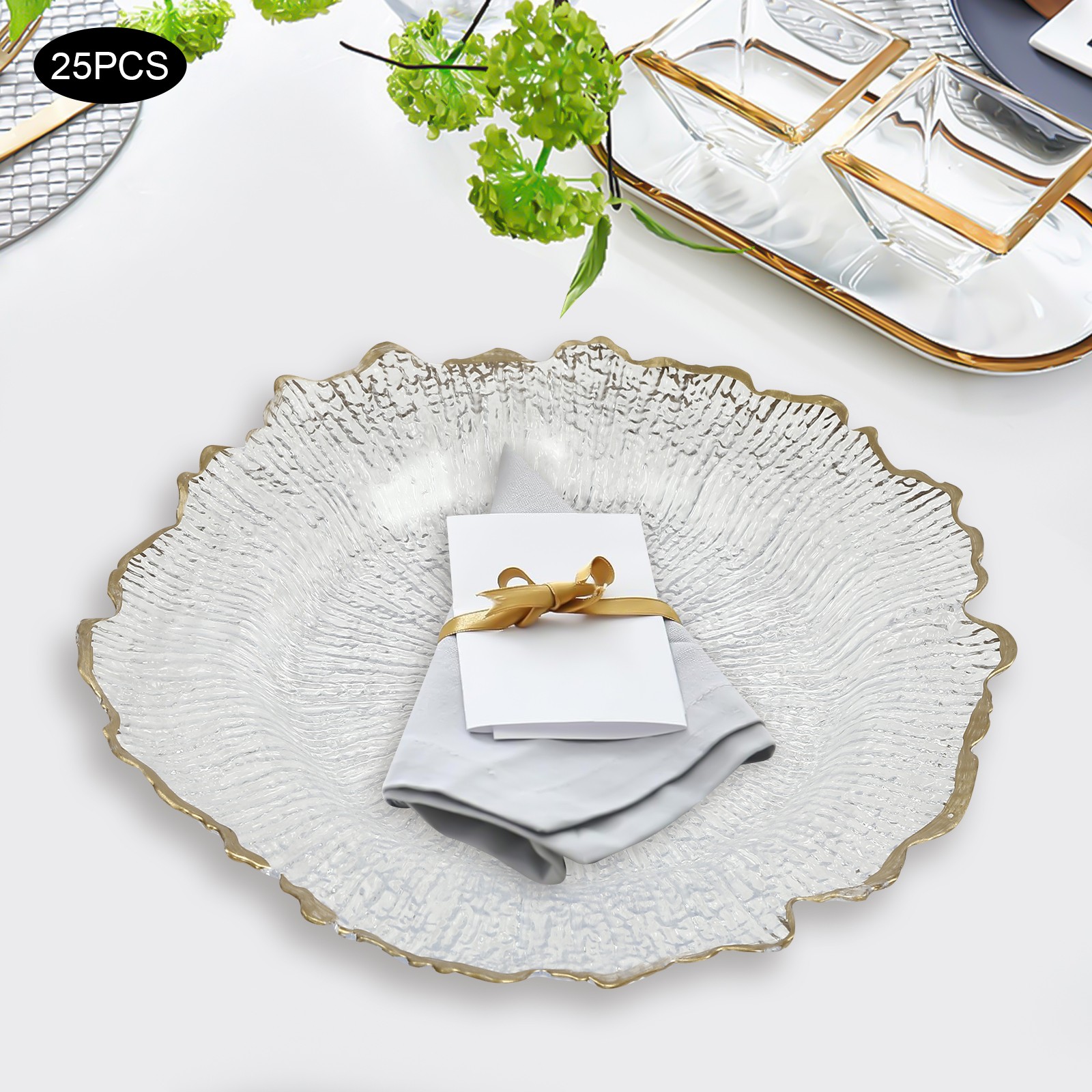 size and stackable design, it is very easy to store in your kitchen cabinet or drawer without taking out too much place. Effortless Cleaning: With a smooth surface, it is very easy to clean the food residue or oil on the plates by gently wiping with a damp cloth or water flushing for the next use. Ready to Use: They are assembly-free and are capable of being used at your dinner table once you receive them. 25 Pieces: The package includes 25 pieces of plates, which is enough for small or middle parties or dining events. You can also order more to fulfill a larger need. Ideal Gift: Its beautiful outlook and sturdy body make it a nice gift for your friends, families or colleagues. Customer Service: We aim to provide quality products and services. If you have any problems, please feel free to contact us. We will reply and solve the problem for you as soon as possible. DetailsRound Edges: The rounded edge design is not only aesthetically pleasing, but also enhances safety in use. Sinking Bottom: It provides a proper place for placing salad bowls, soup bowls and entree plates to prevent accidental spills and protect your table. ApplicationIt is suitable for banquets, weddings, bridal showers, birthday parties, baby showers, holiday parties, waterfront events, and eye-catching, enhanced food displays. SpecificationsColor: Clear, GoldMaterial: PSSurface Treatment: Hot StampingShape: Flower ShapeNumber of Pieces: 25Assembly Required: NoEach Product External Diameter: 32cm/12.6inchEach Product Inner Diameter: 19cm/7.48inchPackaging Size: 33*33*17cm/12.99*12.99*6.69inchGross Weight: 7.5kg/16.53lbsNet Weight:5.5kg/12.13lbs Package Included25* Charger Plates NotesPlease check the