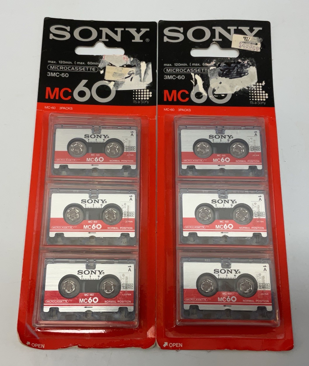 2 packs of 3 MicrocassettesNew Factory sealed. Packaging has storage and sticker damage.The Sony Microcassette MC-60 Min Recordable Cassette Tapes are a set of three factory-sealed tapes designed for recording audio. With a capacity of 60 minutes per tape, these microcassettes are perfect for capturing music, speeches, or any other audio recordings. Manufactured in 1998 by Sony, a trusted brand in electronics, these recordable cassette tapes are a reliable and high-quality option for preserving audio content.
