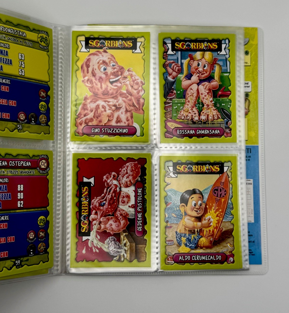 2018 Topps Italy SGORBIONS Italian Garbage Pail Kids Nearly Complete Card Album (83/95 Cards) + Book.Very close to a complete set of 2018 Sgorbions.Condition: Album and Cards: EX+