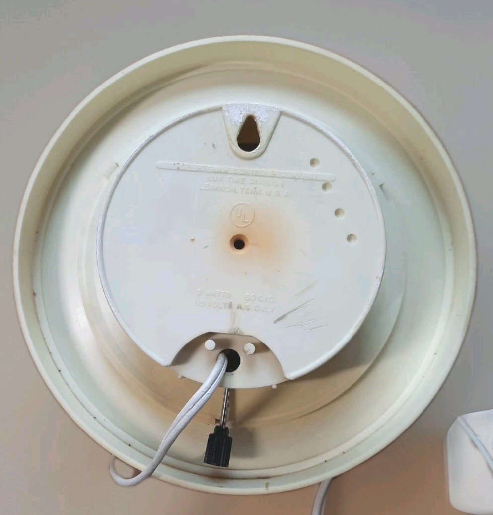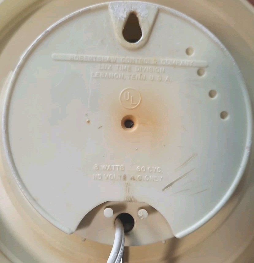 Lux wall clockRobert Shaw Controls CompanyMade in the USAApproximately 7" roundBlack hour and minute hands, red seconds handGold circle on ivoryThe area behind the hands is tan with copper printI have seen the print design described as Atomic Starburst but it looks more like a compass symbol to meItem is in working condition with flawsCondition: vintage preowned - the clear plastic that goes over the center area of clock is missing and the screw in the back that holds face on so the face of clock will come out when placed face down is also missing. There are some scratches, wear, and discoloration.Please save "Serendipity Juntiques" to your favorites. Check back often - new items added weeklyMessage me with any questions and I will gladly answer them.Thanks for looking and have a blessed day!