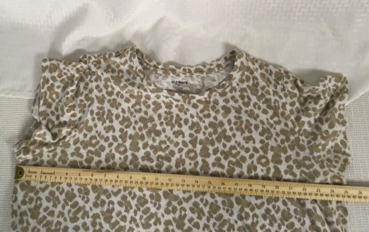 Old Navy Womens Top Size XXL Ivory Brown Leopard Print T shirt short SleevesIvory & Brown Leopard PrintT shirtShort SleevesSize: XXLMeasurements: Measurements are also in the photos.Chest: 50 inchesBack Length: 23 inchesSleeves: 6 inchesPlease also see photo of the measurementsCondition: In good condition, no holes or stains, please see photos for the condition and details. Thank you so much!