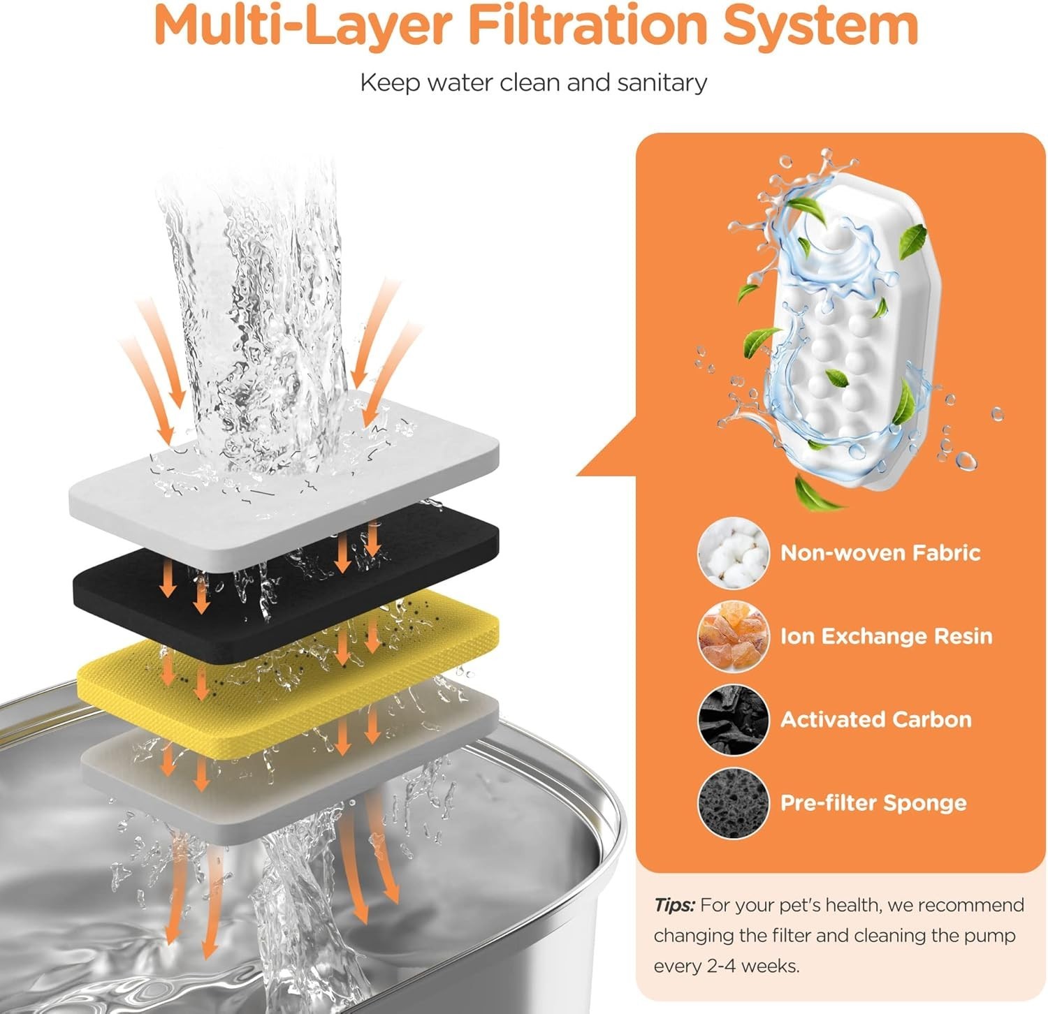 | Features | 304 Stainless Steel, Large Capacity, Quiet Operation, Energy Saving, Filtration System, Easy to Clean, BPA-Free, Dishwasher Safe, Quadruple Filtration System, Ultra-Silent Pump, Double Water Flow Design, Removable Components, Replaceable Filters, Non-Spill |