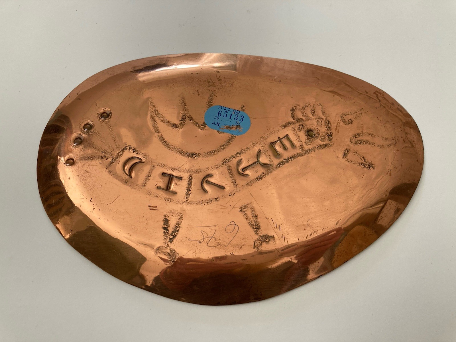 Vintage Mid Century Copper Kidney Shape Dish Abstract Bird Motif
