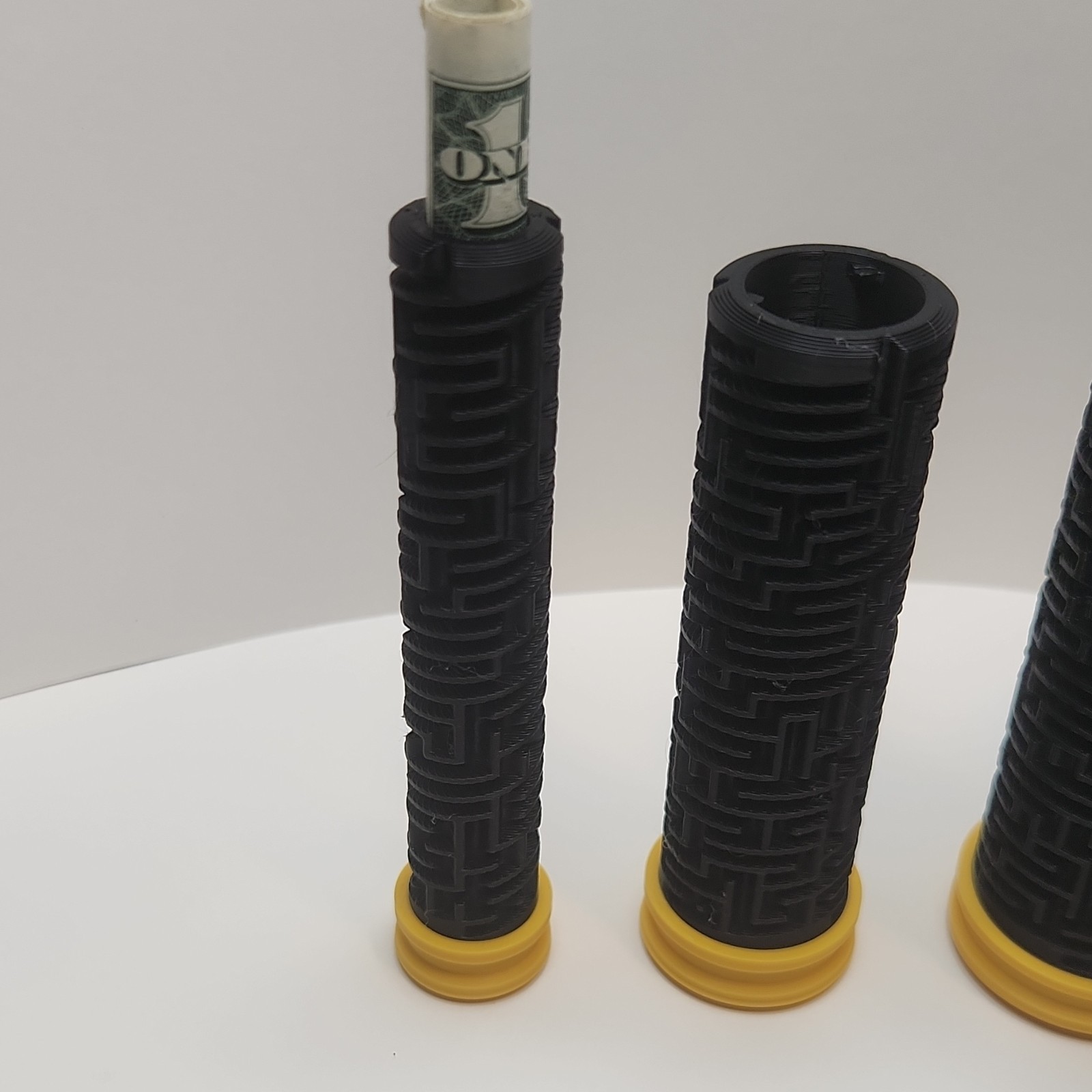 The Maze Puzzle Box, Russian Doll Concept, Four puzzle pieces, Money Gift hidden secret inside. Colored Black & Yellow. It is a unique and intricate puzzle box that is designed in a cylindrical shape with 4 pieces. The puzzle box is made of plastic, with a striking black and yellow