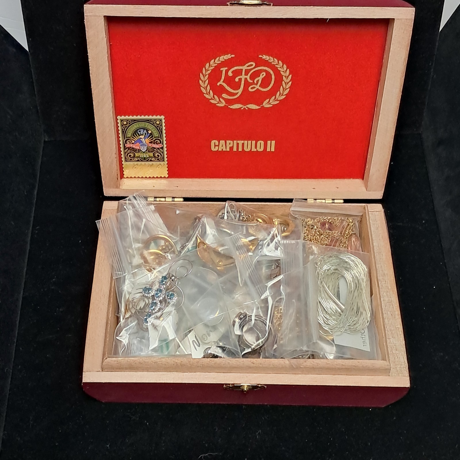Jewelry Lot contains A hoard of sterling silver and great quality costume Jewelry . Makers marks include John Wind, Monet, 1929, Trifari, and Ecclissi Sterling Silver Watch which needs a Battery. The blue gemstone cocktail ring has Silver markings but I am not sure if it is.. I didn't put much value on it other than it's a great looking ring. I will ship this out to you in a wood cigar box..