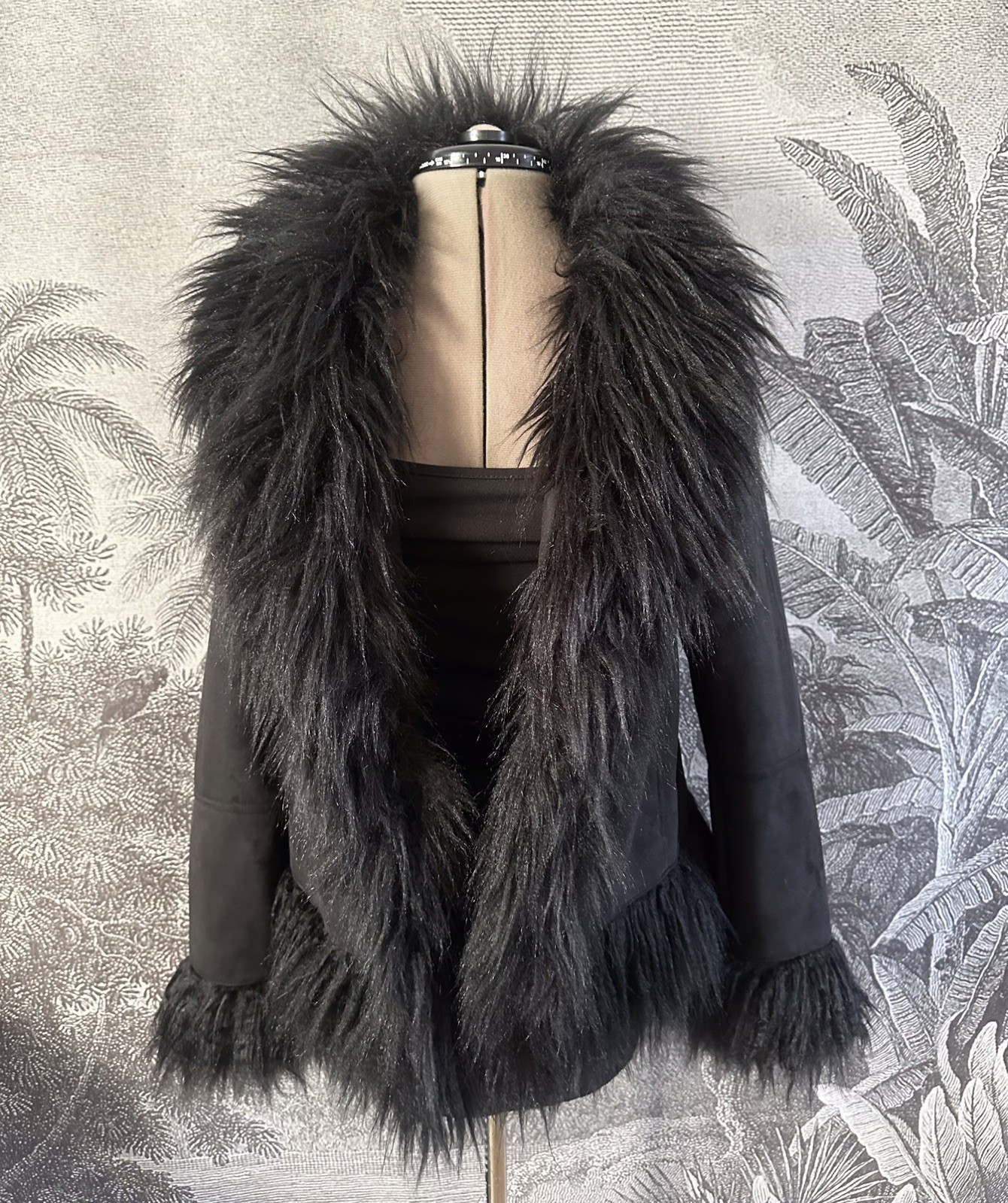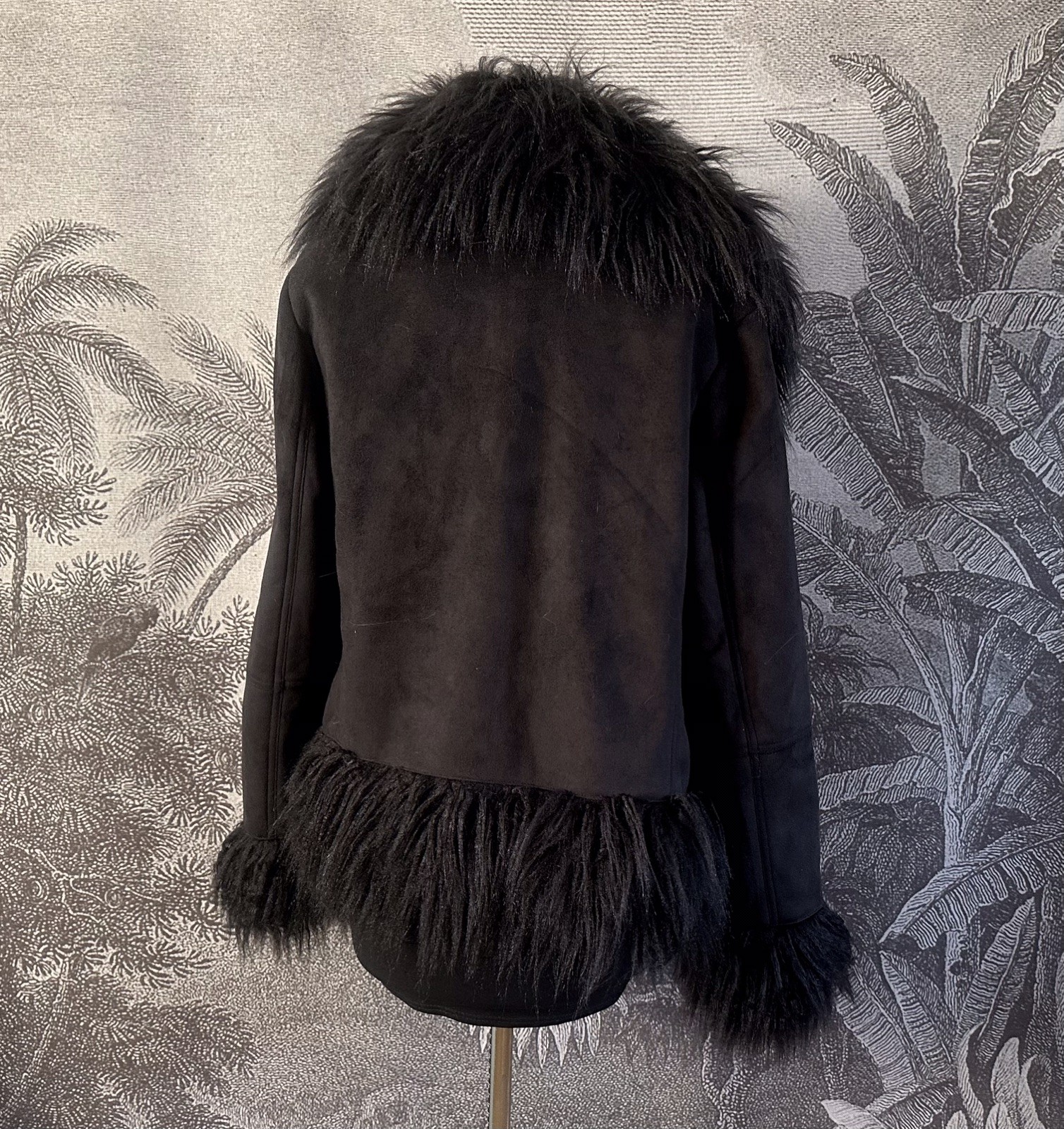 Faux Fur Afghan CoatSize Label - UK 6 (USA Size 2 and European Size 34)This coat has a 70’s throwback vibe with its Mongolian fur cuffs & trim. In a classic black colour, it fastens with concealed hook and eye fastenings to the front.MEASUREMENTSAll measurements are approximate and taken with coat laid flatMeasurement armpit to Armpit approx 19”Underarm to hem approx 16”Underarm to Cuff - 18.5”CARETags indicate to dry clean the coat Coat is in very good condition. Perfect for Autumn, Winter and Spring!