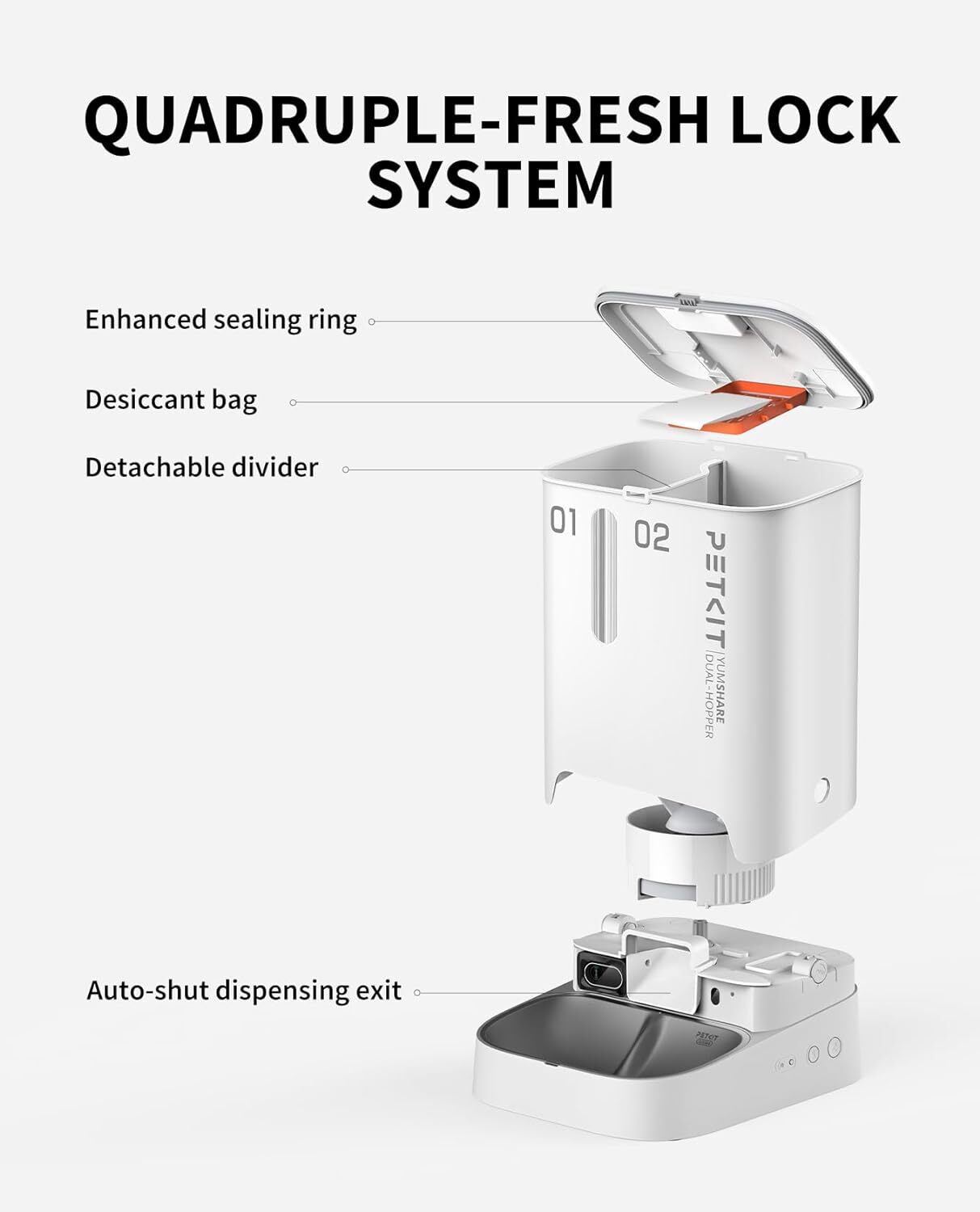 accessories as brand new condition. Please ensure you don't mind before placing orders. Thank you! 1080P HD Camera with 24H AI Capturing: Superb 1080P high resolution and 140°wide viewing angle video camera makes it easily to capture and record your pet's day-to-day activities. The IR night vision feature lets you see your pets clearly in the dark.User-Friendly Smart App Control: PETKIT YumShare dual hopper smart pet feeder is 2.4GHz WiFi-enabled, allowing you to program and monitor your pet's meals anytime anywhere through the PETKIT app. Innovative Dual Hopper Design: Customize respective feeding plans for 2 hoppers via the PETKIT app with 1-10 portions per meal in each hopper. 5L (21-cup) large capacity is estimated to store about 5 lbs of food, compatible with freeze-dried food,mixed food,dry food,air-dried food,that the