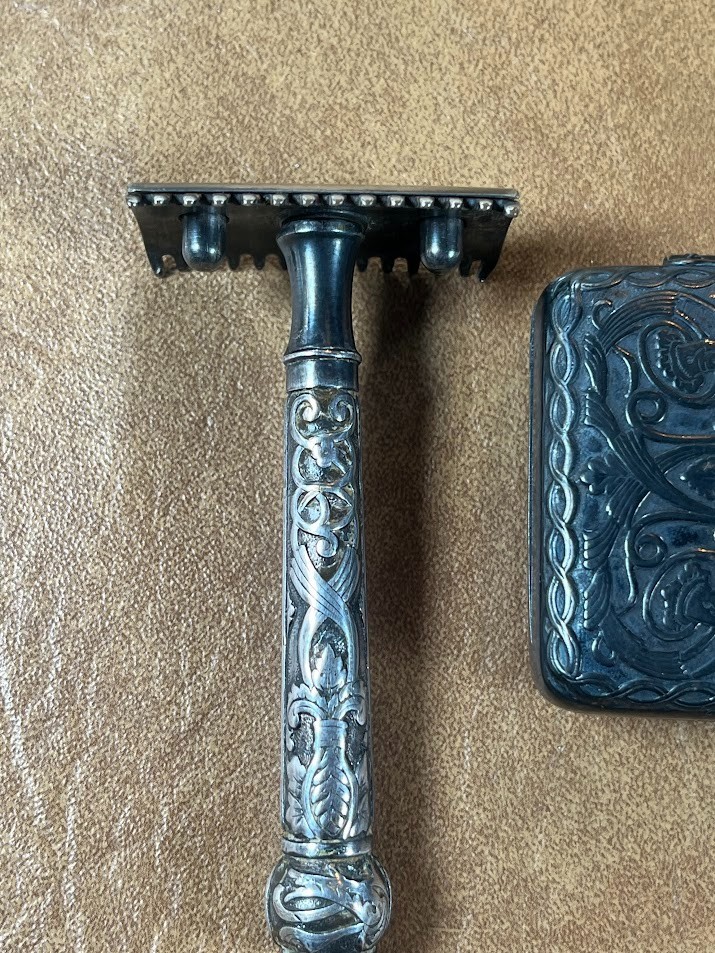 This ABC Pocket Edition Gillette Old Type silver tone double edge (DE) safety razor is offered in used condition, making it a collectible option for vintage shaving enthusiasts. The original description does not provide details on included case, accessories, exact materials, or any flaws, so check the listing for details. Priced at $299.99, it ships with free shipping. Review the photos and seller notes in the listing to confirm cosmetic wear, completeness, and any functional or mechanical considerations before purchase.