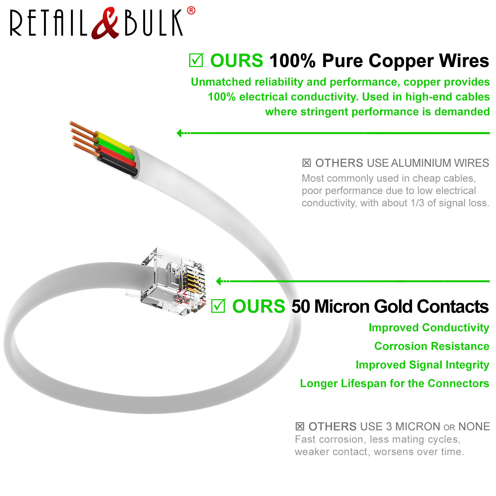 | Features | 100% Bare Copper, 50µ Gold Plated Contacts |