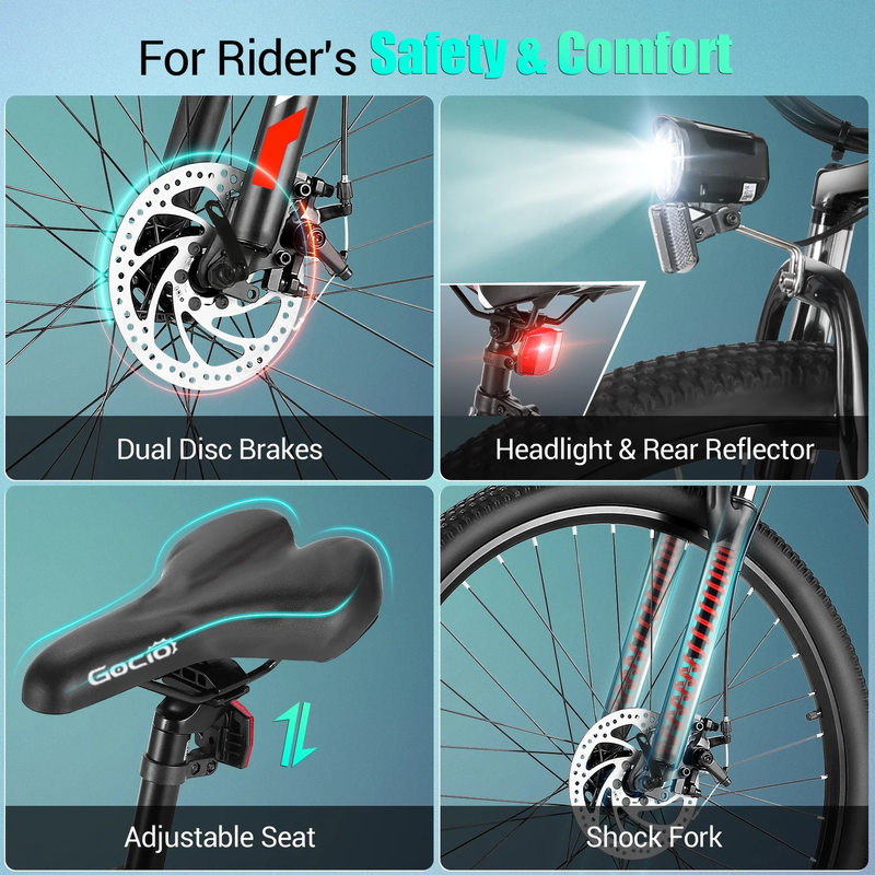Gocio Electric Mountain Bike / City Ebike / Road Ebike / Commuter Ebike / Ebike for Adults Designed Specifically for Men Explore, Exercise, Commute Mountain, City, Highways ✨Main Features: 🚴【27.5 inch Big Wheels】The ebike features 27.5-inch wheels that are perfect for riding smoothly on various terrains. The high-grip tread pattern on tires provides excellent traction on hillsides, gravel paths, city streets, back roads. Go wherever you want to go! 🚴【500W Powerful Motor】The electric bike is equipped with a 500W rear hub motor, which provides more torque so that it can accelerate faster and uphills more easily. Max. speed reach up to 22mph. Thanks to the quiet-running motors, noise is not generated while riding. 🚴【48V 10.4Ah Removable Battery】 This 499.2WH battery (UL 2849 certified) is powerful enough to support 25-30 miles in electric mode and 40-50 miles in PAS mode per charge. You can commute to work or leisurely ride without worrying about running down battery. The BMS system in the battery is to improve battery utilization and prevent overcharging and over-discharging. The battery is removable and lockable with two keys to prevent thievery. 🚴【5 Riding Modes】 Electric, pedal-assist, Normal bike, cruise control and walk push mode. You can easy to choose different assistance when you are enjoying a long-time journey. If you want to get less sweat, simply twist the throttle and the ebike will automatically propel itself. You can shut off the motor as well if you're looking for a little exercise. 🚴【High-Performance Components】 This moutain ebike is made of lighter aluminum alloy frame, which more lightweight than that made of iron. The high-strength shock absorption fork make it more stable in all road conditions. Shimano 21 speed gears will be more responsive when you choose to acclerate or save labor. Equipped with HD smart LCD display lets you grasp the assist level/speed/battery/mileage information in real time, makes you riding more peace of mind. 🚴【Customer Service】 The e-bike arrives 85% pre-assembled and all the tools required to assemble are included. You can also contact us for installation videos. If there any issue with it, please don't hesitate to contact us. We are pleased to reply to you patiently within 24 hours. Ebike Highlights: 27.5" Big Wheels Multi-scene & Multi-purpose Use 500W Motor & 48V 10.4Ah Battery Aluminum Alloy Lightweight Frame HD Smart LCD Display Ebike Details: Type: Electric Bike for Adults Color: Red, Blue Material: Aluminum Alloy Suspension Type: Front Speed Gear: Shimano 21 Speed Shifter Brake:Double Disc Brakes 5 Bike Mode: Normal Bike/Ebike/Pedal-Assisted Bike/Walk Push/ Cruise Mode Headlamp:LED Ebike Specifications: Motor Power: 500W Max. Speed: 22MPH Battery: 48V/10.4Ah Lithium Ion Battery(UL 2849 certified) Mileage: 25-30 Miles(Electric Mode); 40-50 Miles(PAS Mode) Charging Time: 4-6Hours Wheel Diameter: 27.5inch Bicycle weight: 50lbs Assemble Dimensions: 69.7 x 27.1 x 39.4 inch Load Capacity: 330lbs Fit Height::5'3"-6'4" Package Content: 1 x Electric Bike 1 x Lithium-Ion Battery 1 x Battery Charger 1 x User Manual 1 x Tool Kit 2 x Keys 2 x Fenders 2 x Pedals