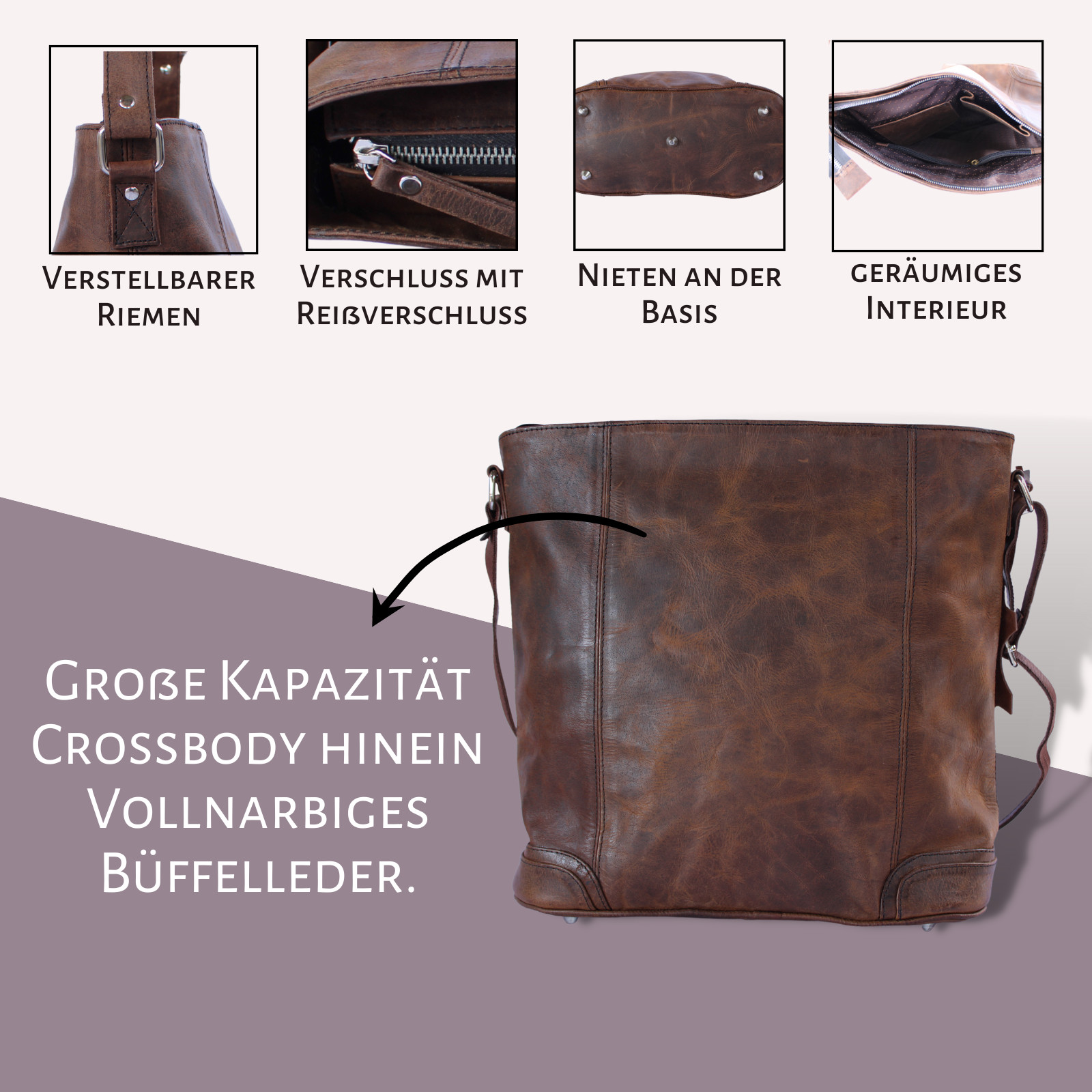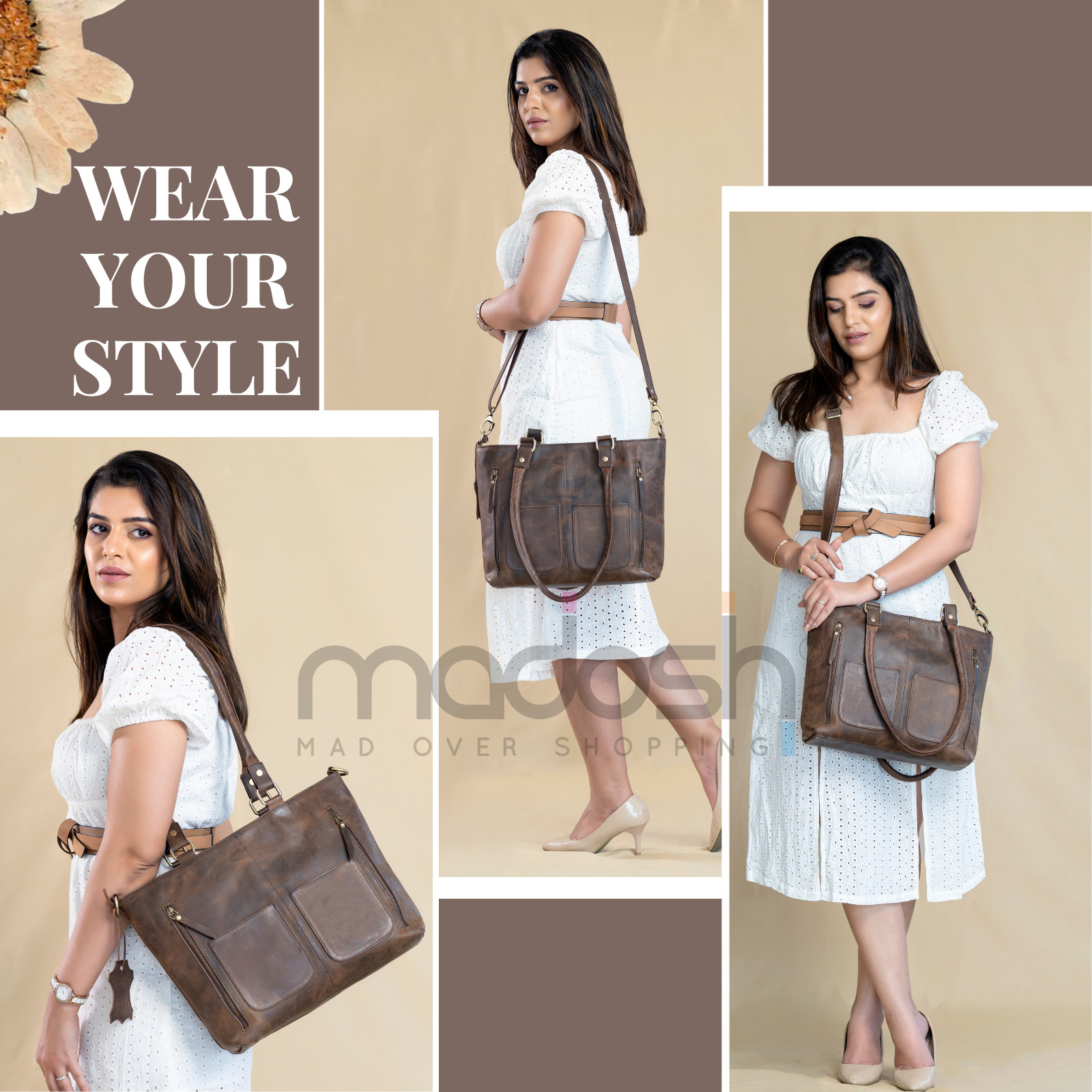 This brown one Leather handbag by MADOSH strikes a perfect balance of form and function to create a reliable tote bag for everyday use.This structured and functional Genuine buffalo leather bag gives you a hobo look and also can easily carry all your daily stuffs. So easy to pair with your daily outfits, this bag is ideal for everyday use.Size inspired by your daily lifestyle; This medium-volume shoulder bag single-handedly handles the aesthetic burden. All essentials fit so well in this full grain shoulder bag. The straps can be adjusted to be worn longer over the shoulder or as a crossbody bag.It opens to a main compartment for your personal belongings like laptop, notebooks, magazines, documents, water bottle, wallet, etc. with 1 zip and 2 slip pockets inside. It uses a zipper at the top of the bag that keeps your belongings secure. And the rivets at the bottom of the bag keep it stable for easy handling.It will not go out of style, it is the bag that is definitely in every woman's wardrobe.SIZE & FIT –Dimensions: Height: 13” (33 cm) | Length: 16" (40.64cm) | Width: 6" (15.24cm)Shoulder Strap Drop: 17.5” (44.45 cm)Shoulder strap length: 40” (101.60 cm)Details:Leather: buffalo leatherLining material: cottonInner compartment: 1Inside pockets: 3Closure: ZipperProduction: handworkStrap Type: Crossbody / ShoulderCountry of origin: IndiaNote:✔ Strong, robust buffalo leather tanned without the use of chemicals.✔ Variations in the texture and