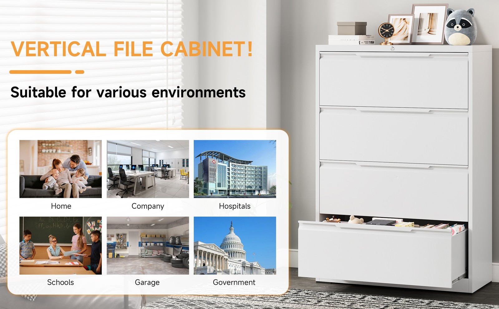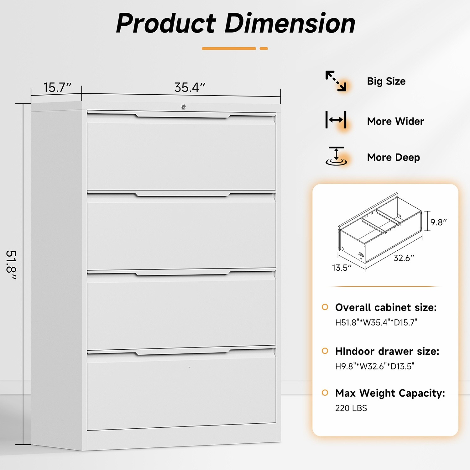 Lateral Metal File Cabinet for A4/Legal,Office Organizer 4Drawer Storage CabinetAbout this item[Practical Large Space] This 4-drawer file cabinet has a large storage space. 15.74 inches deep x 35.43 inches wide x 51.81 inches high. The top platform of the office file cabinet doubles as a printer stand. Each drawer has adjustable hanging bars so you can adjust the bars as needed and store A4/F4/Letter/Legal and more.[Long Product Life] The 4 drawers filing cabinet is made of high quality cold rolled sheet, which makes the locking filing cabinet stronger and less deformable as a whole. The lateral file cabinet is made of environmentally friendly high quality powder with strong adhesion, high toughness, easy to clean and not easy to rust.[Interlocking System] The metal filing cabinets are equipped with an anti-tilt interlocking device. When one of the drawers of the lateral file cabinet is opened, the other drawers cannot be opened, thus preventing them from opening at the same time and causing tipping. One key can lock all drawers for convenience and safety.[Personalized Design] This metal storage cabinet is designed with a new type of pull handle, which is simple and beautiful, and more convenient to use. The drawers are equipped with metal mute rails, which will not affect the working environment during use, and each drawer can bear 110 pounds. The locking cabinet is designed with labeled card slots, allowing you to find items and files efficiently and quickly.[Need to assemble] Office filing cabinets that require assembly. We provide assembly instructions and assembly video to help you assemble and use it faster. Please contact us if you have any questions after purchasing the file cabinet, we will reply you promptly within 24 hours.