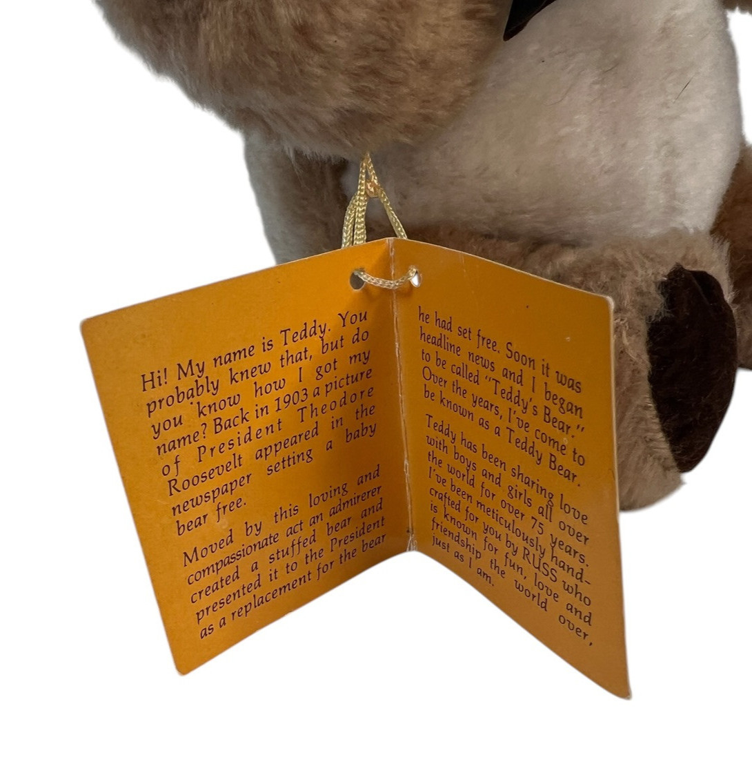 This Russ Berrie "Teddy" brown teddy bear plush is a small 7-inch sitting style with a bow tie. Condition is used, and the tag is damaged as noted. It may show typical signs of prior handling or display; check the listing for details on any additional wear, cleaning, or markings. Free shipping is included. Review the listing photos and description to confirm size, exact look, and condition before purchase.