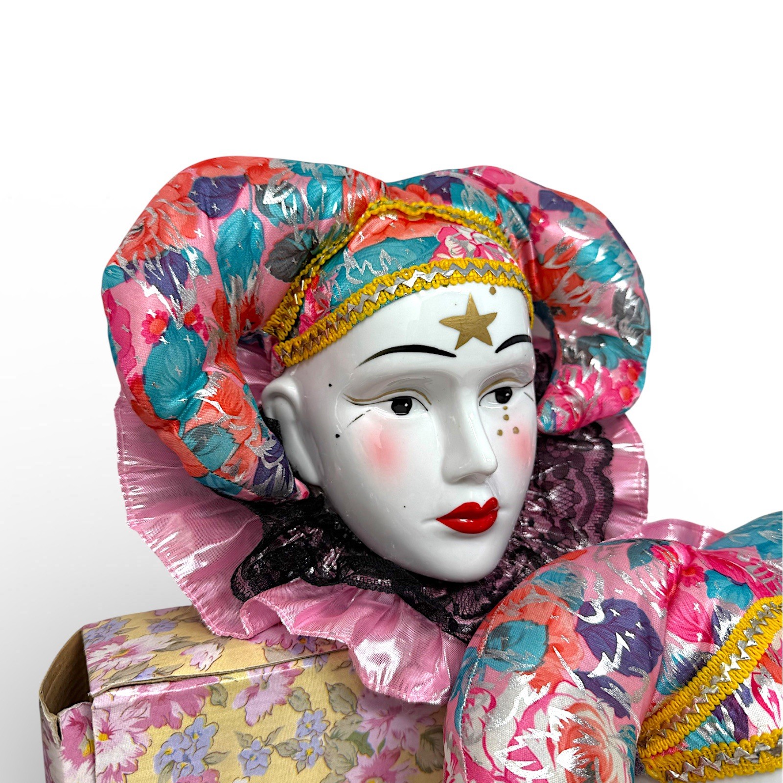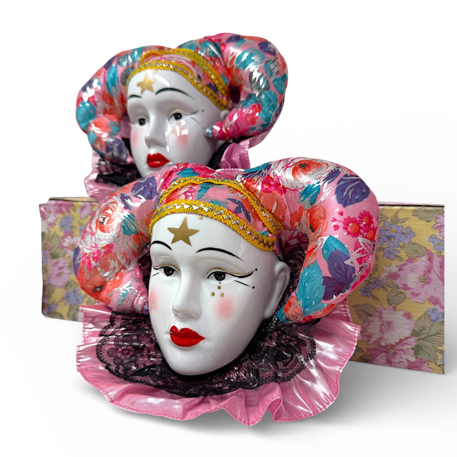 This lot of 2 New Vintage Old Stock jester clown masks that are made of porcelain with a colorful painted finish. Each measures approximately 10”x 10.5”. Designed for wall mounting and can add a decorative touch to any room in your home. Easy to clean with a damp cloth, these masks are a unique and eye-catching collectible for those who appreciate vintage decor. Please see photos for details.