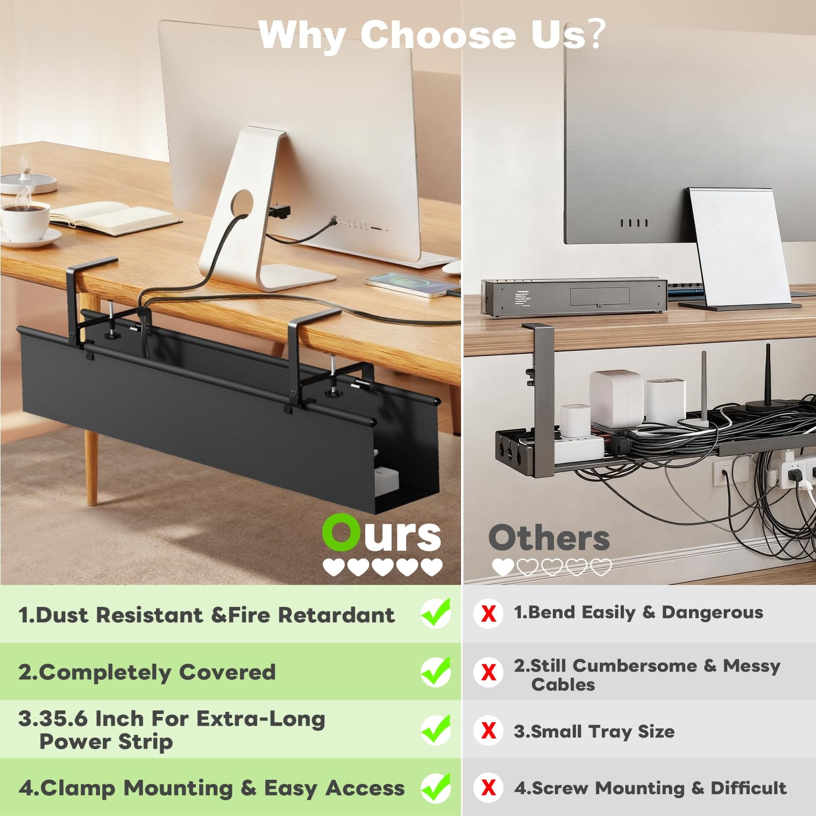accessories. Plus, our innovative clip design allows for faster and easier cable organization, creating a tidy workspace with minimal effort. What You Will Get: Upgrade to a under desk cable management tray kit (Dimensions: 35.6"L x 5"W x 5.5"H) along with 12 additional cable ties. Say goodbye to messy, tangled cords on your desk or floor, and eliminate worries about kids tripping or cords being sucked up by the vacuum cleaner. Material: Durable fabric (hides wires, keeps tidy); dustproof & flame-retardant (safe).Installation: Drill-free clamp + screw-fix. C-clamps fit metal/wood/glass desks; tray unfolds for easy use, built-in ties secure items.Compatibility: Fits 0.43–2.2 inch thick desks (metal/wood/glass); multi-functional (cord management/holders/organizers/baskets).Usage: Home/office/study. Organizes cords/ethernet/power cables/USB hubs/strips; innovative clips for quick arrangement.Package: 1 tray (35.6""L x 5""W x 5.5""H) + 12 extra ties. Prevents mess, tripping, vacuum-sucked cords.