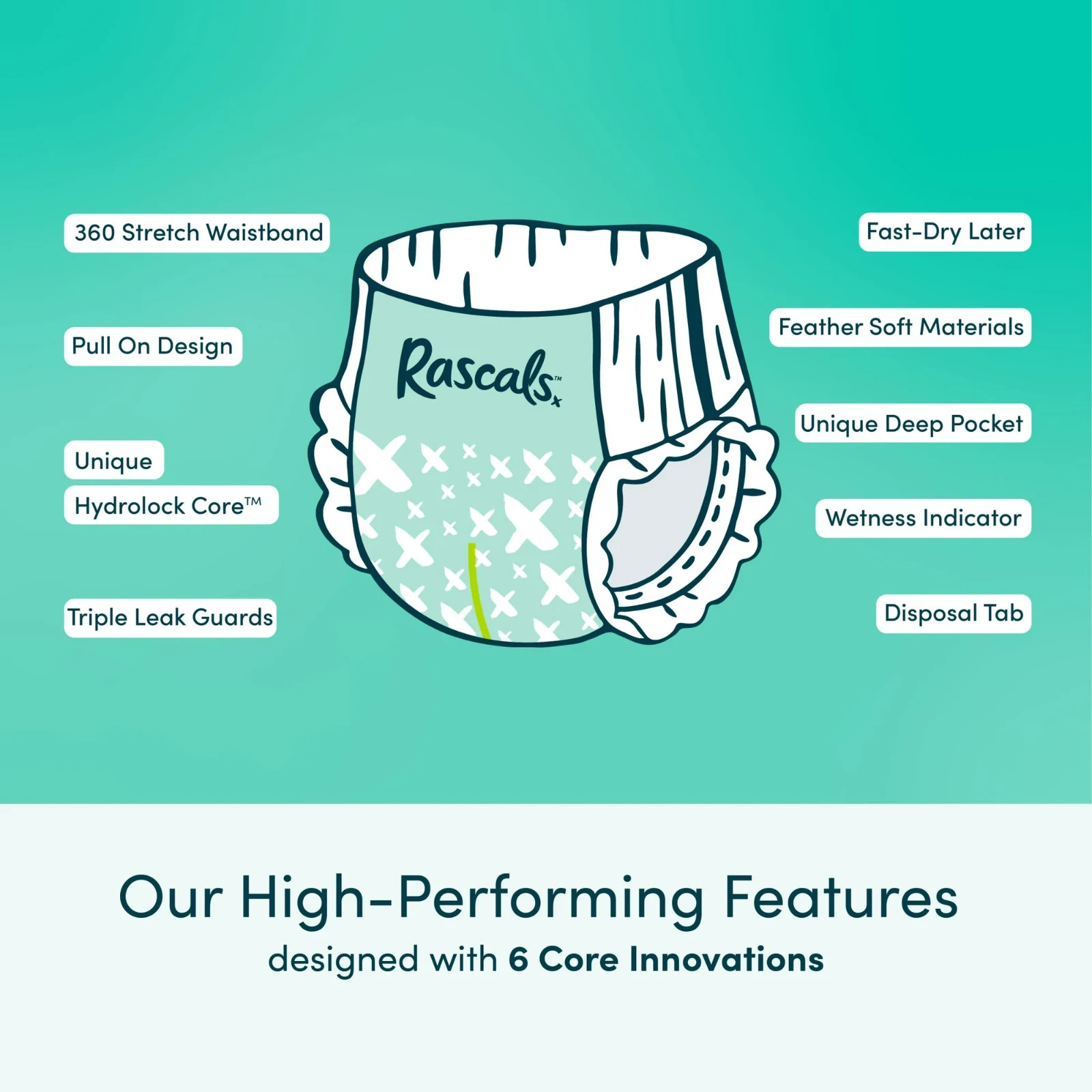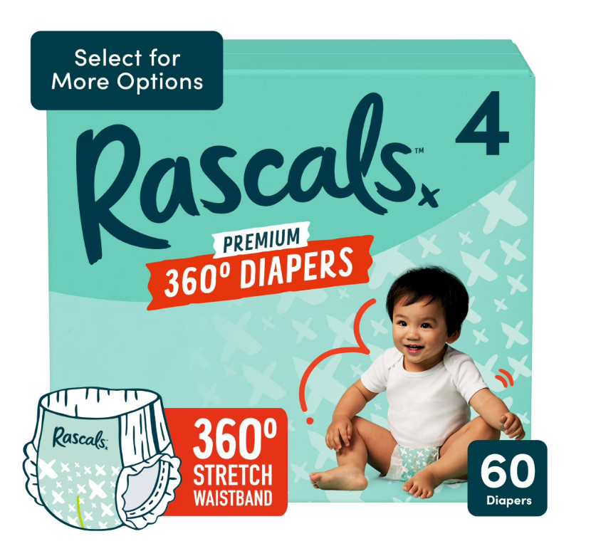Rascals Premium 360 Absorbent Pull-On Diapers, Size 4, 60 CountKey item features360° Stretch Waistband: Made for active babies with a 360 Stretch Waistband that flexes as your baby moves. No tape, no fuss!Easy Pull On Design: Our Pull On Design is here to help make standing changes easy, with quick on & off for wriggling babies.Advanced Leak Protection: Our unique deep pocket and triple leak guards offer advanced protection from leaks and blowouts.Unique Hydrolock Core™: Our Hydrolock Core™ absorbs liquid with 4 layers of protection to help keep leaks containedAirSpun™ Softness: Using AirSpun™ Technology our diaper materials are hot-air bonded for a breathable, feather-soft feel that is gentle on skin.Zero Nasties*: Hypoallergenic and dermatologist tested, our training pant materials are gentle on delicate skin.