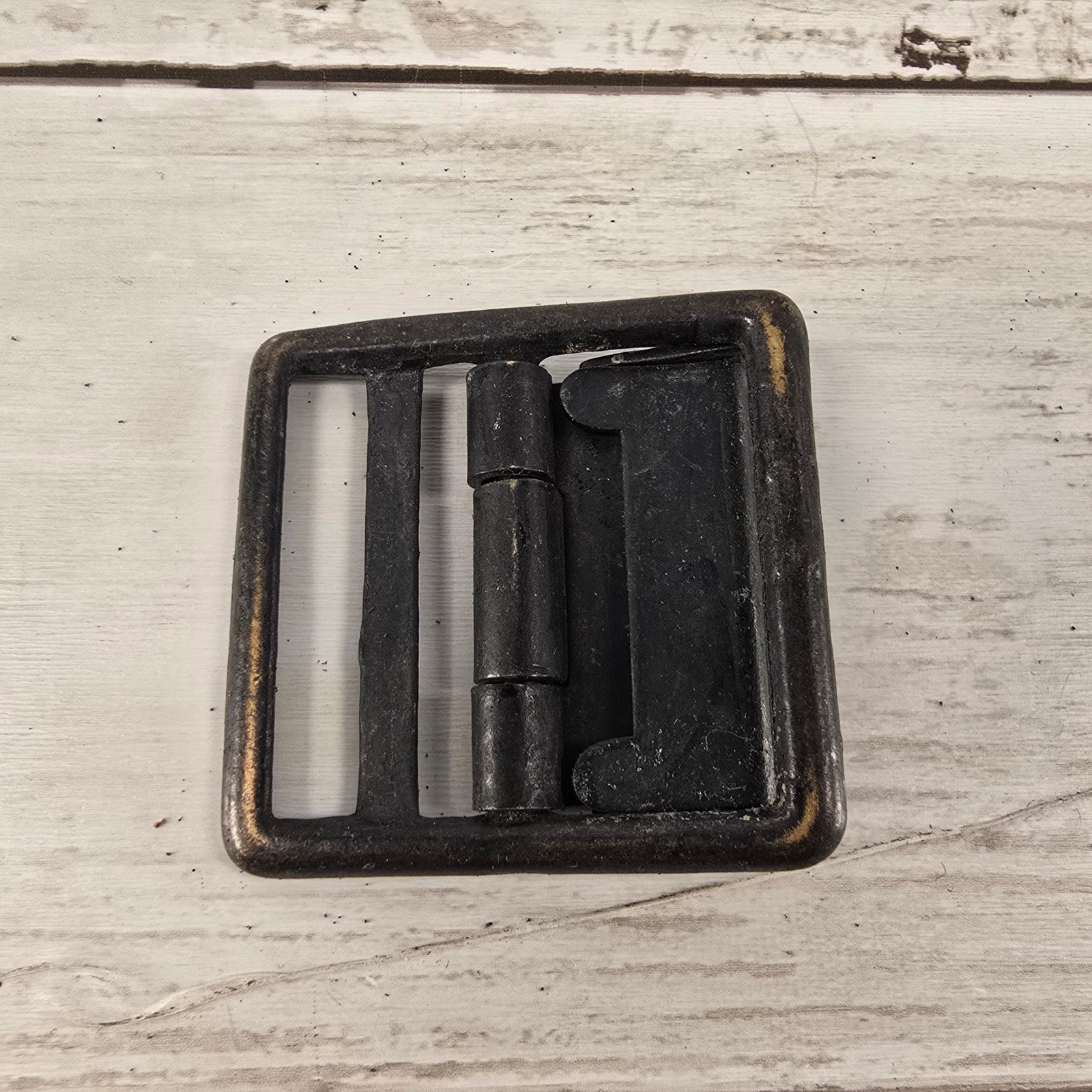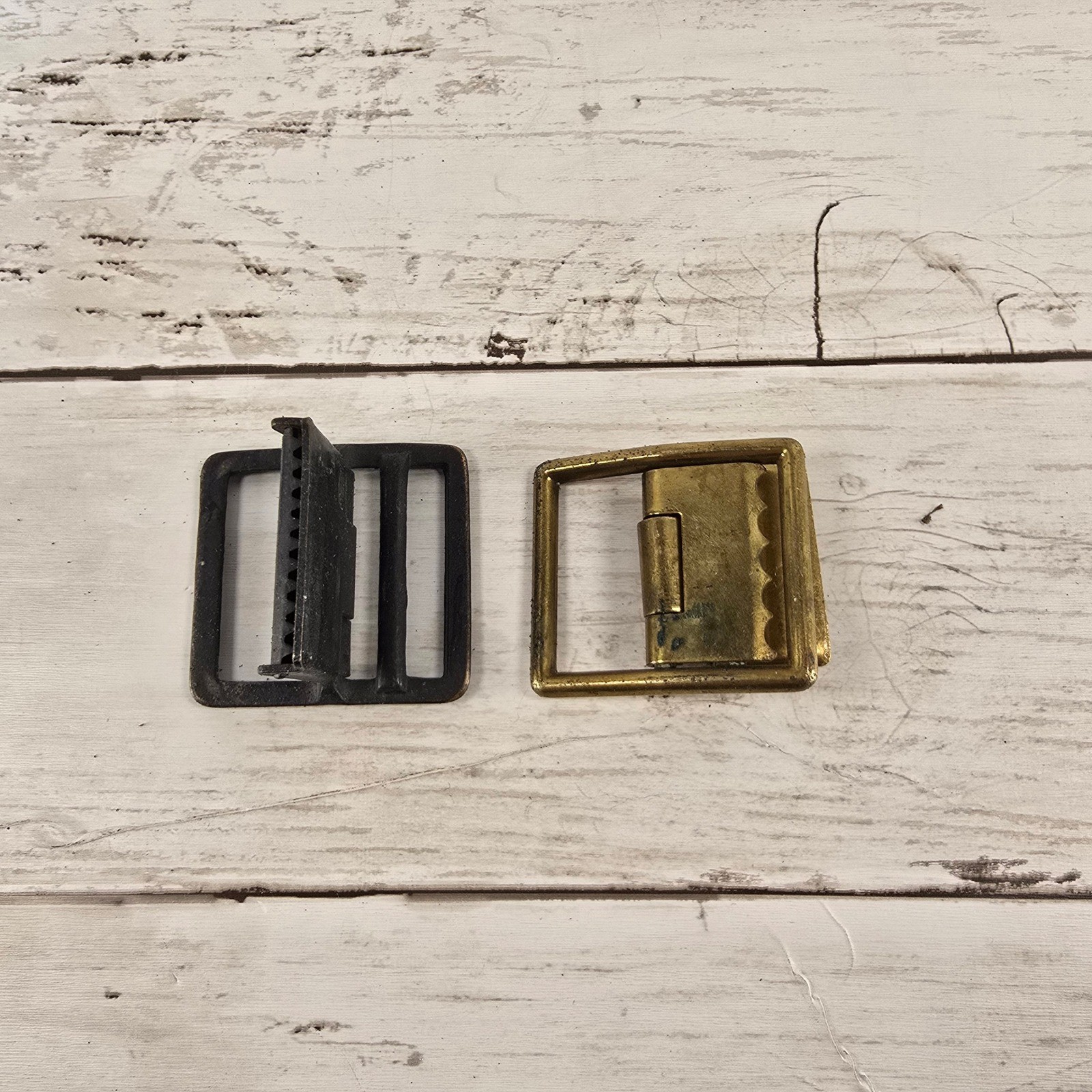 Vintage metal cinch buckles set includes two distinct pieces, one in a dark aged bronze or black finish and the other in a classic brass tone. These friction-style slide buckles feature a hinged toothed mechanism designed to securely grip fabric or webbing, making them ideal for vests, trousers, or bag straps. The rectangular frames show a natural aged patina that adds authentic vintage character to any repair or sewing project. Perfect for historical reenactment garments, workwear restoration, or custom accessory crafting.