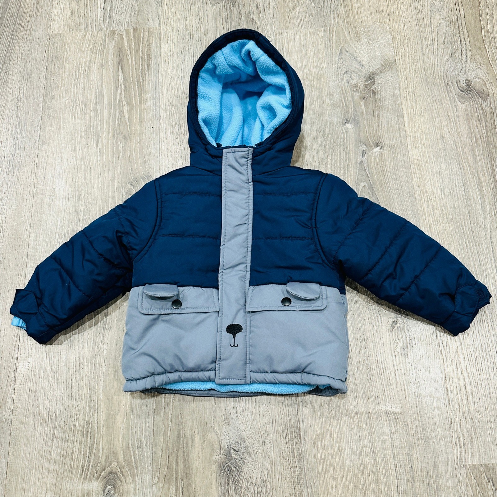Classic and Unique Carter's puffer jacket provides essential warmth for cold weather. This hooded outerwear piece features a colorblock design in navy and grey, accented by a cozy light blue fleece lining. The front includes a full-zip closure with a Velcro storm flap, two snap-button flap pockets, and a charming bear nose and mouth detail on the placket. Designed for durability and comfort, it includes elasticized cuffs and a hem to keep the chill out, while the interior name tag allows for easy identification.Brand: Carter'sType: Puffer JacketStyle: Hooded ColorblockColor: Navy Blue, Grey, Light BlueMaterial: 100% Polyester Shell, Lining, and FillClosure: Full Zip with Velcro FlapFeatures: Fleece Lined, Snap Pockets, Bear DetailSleeve Length: Long SleeveCare: Machine WashableKeywords: winter, outerwear, toddler, boy, warm, insulated, sherpa, teddy, gorpcore, casual, school, play, fall, spring