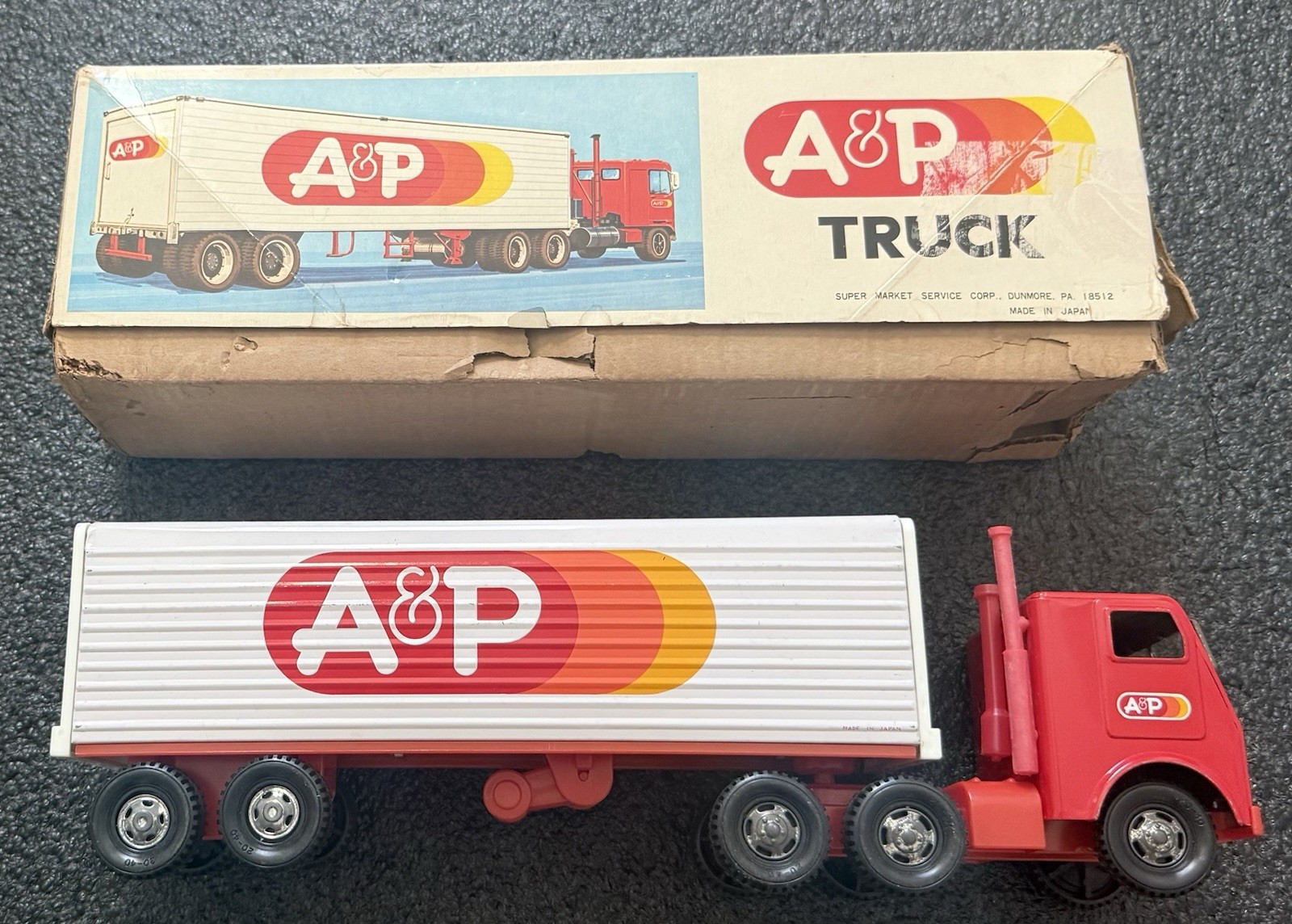 This listing is for a Super cool Vintage 1970's “A&P” Grocery Truck Trailer toy in its original Box. Marked Supermarket Corp Dunmore, Made Japan on the box and Yokohama on the tires. This truck itself is in excellent Condition, Box has lots of wear and cardboard is flaking. . Please see detailed pictures provided for a closer look at condition. Measures 16” x 5” x 3”. Exact item shown in pictures.