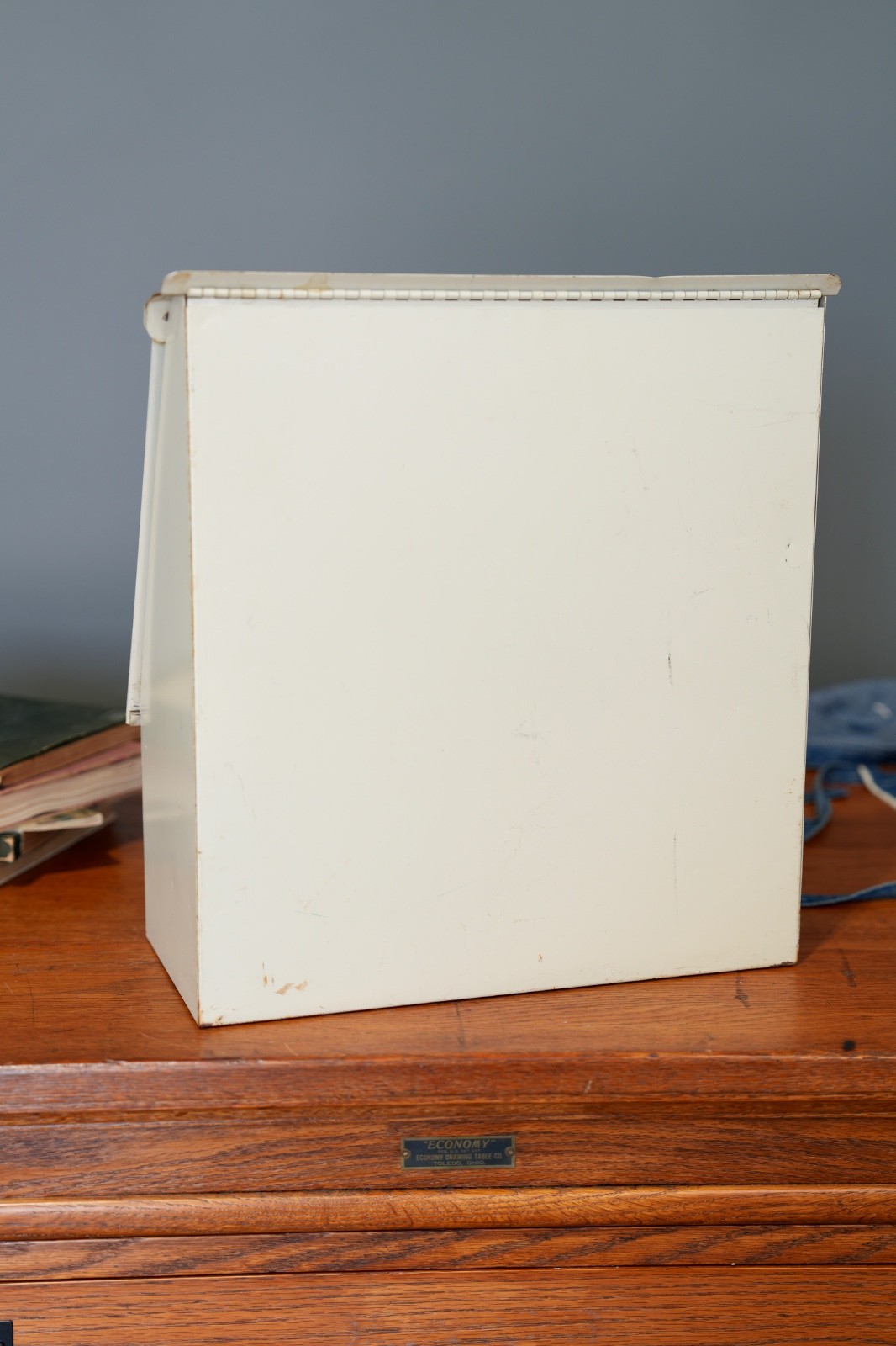 USED CONDITION WITH COSMETIC WEAR FROM AGE. SHOWS SCRATCHES, SCUFFS, MARKS, SOME SURFACE RUST, ETC. MEASURES APPROX: 15" TALL X 14" WIDE X 6" DEEP. PAINT BRUSHES NOT INCLUDED. PLEASE ASK IF YOU HAVE ANY QUESTIONS THANK YOU!