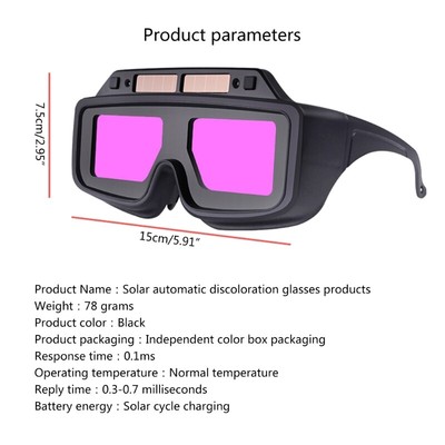 Solar Auto Darkening Welding Goggles PC Protective Glasses Welding Helmets Features: Solar panel can store electricity to provide energy for They are comfortable, lightweight for welding in tight space. The welding protective goggles feature high transmission PC protective glasses that block from welding, are anti-glare, do not harm your eye, and the protective glasses are replaceable. Electric welding goggles with automatic color-changing LCD screen for clear view and accurate positioning. It protects our eye from being injured by sudden flashing of light. Ergonomic designed structure, with ample internal space for myopia glasses, making it easy to operate and comfortable to wear. Specifications: ABS Color: Black Size:Approx.17x15.5x8cm/6.69x6.1x3.15in Package Includes: 1xWelding Goggles note: Please allow 1-2cm errors due to manual measurement,please make sure that you do not mind before you order. Due to the difference between different monitors, the picture may not reflect the actual