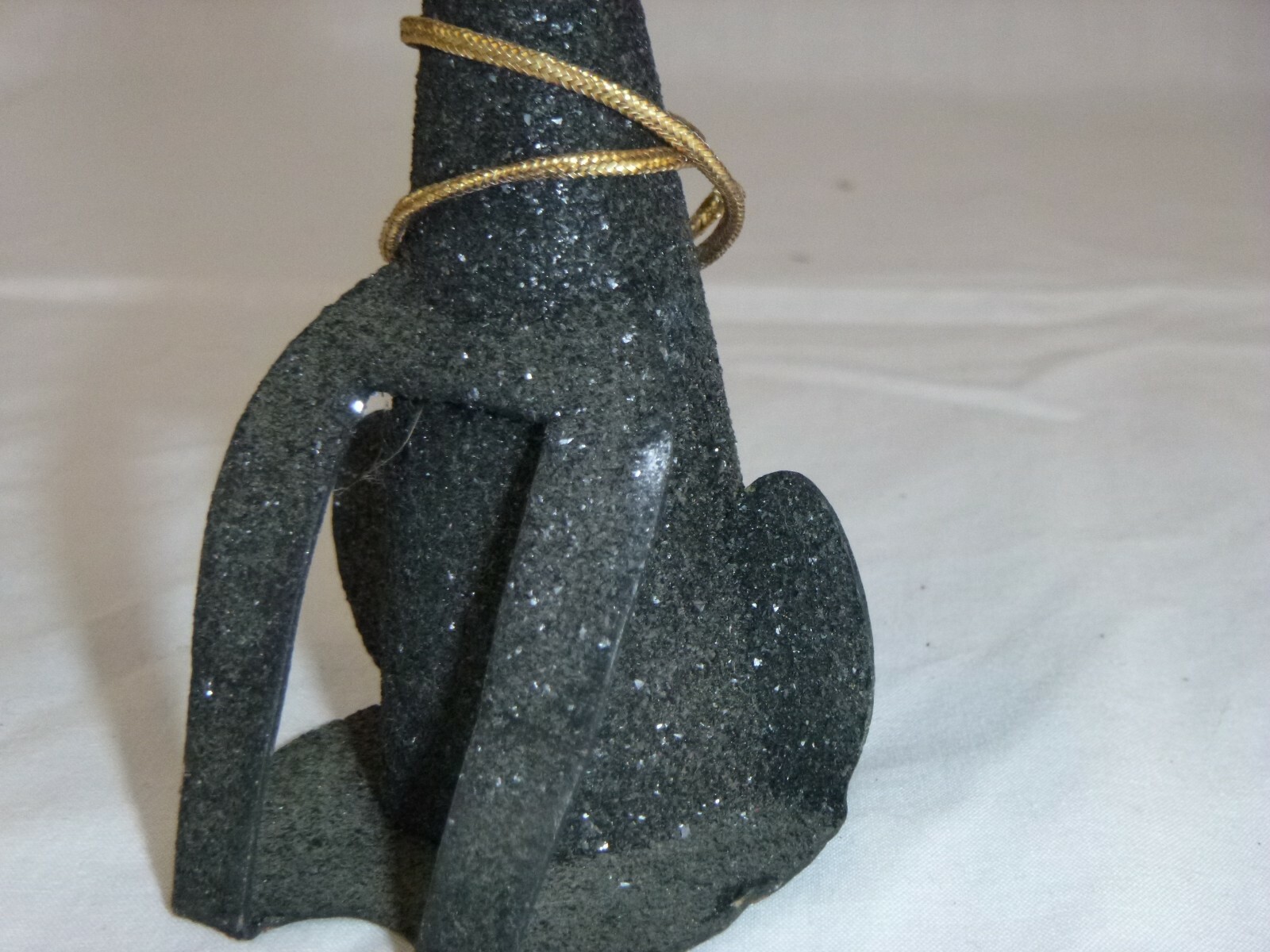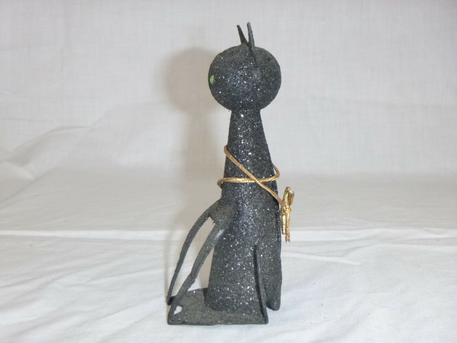 Nice vintage condition. Not sure if the gold cord is original, but I'll leave it on the kitty! has one tiny edge with some glitter loss. A little bit dusty on the surfaces that face up.