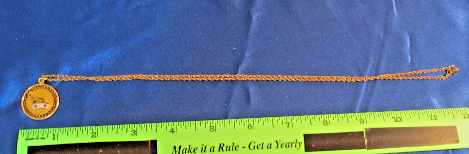 (2 pink stones w 1 clear stone, rare award believed to be from the 1970's era, but not surethe jump ring is marked= unable to read, to small for my magnifying glass and eyes the toggle lock on the chain is marked 1/20 12ksorry for the wiggly photo, the award is quite nice no worriesCondition as shown in the photos. sorry i am not great at photography, best i could do. this is a vintage item for collectors.----------I only ship to address provided by ebay, sorry no exceptions. United States sales and shipment only no ebay international post or whatever it is called, I appreciate your understanding.in the 1970's inflation soared and stock and bond prices collapsed. however during that same decade quality collectibles soared in value. are we about to see a repeat of that decade? Here is your chance to diversify into something tangible. regardless what happens in the financial markets at least with items like in this auction you have something fun to own that also has historical significance.i have and am still loading some rare company years of service award pins and many more. please take a look at my other listings.any props used to show the items
