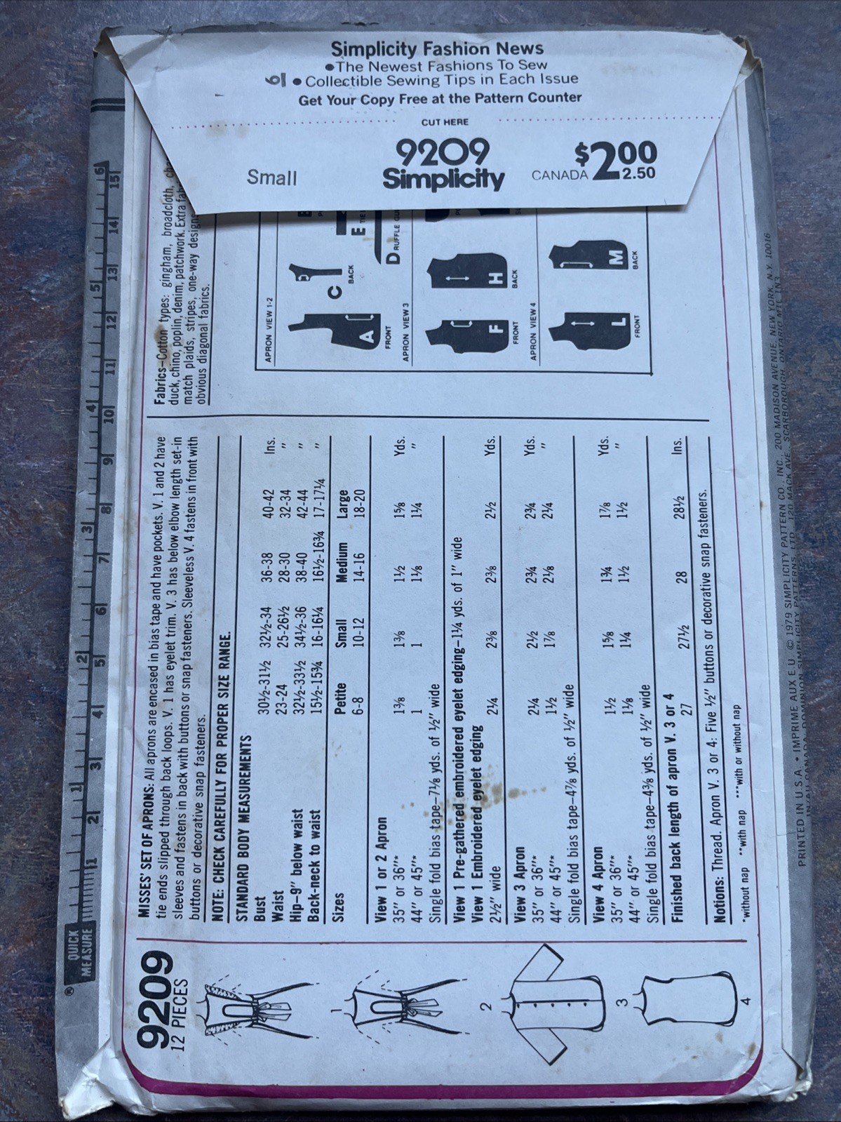 VTG Simplicity 9209 Sewing Pattern Apron Smock 4 Variations - Size misses' 10-12 Specs