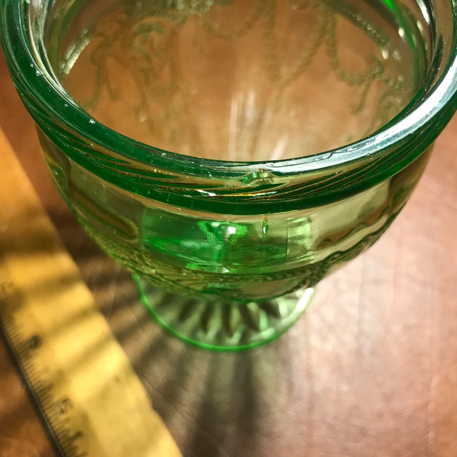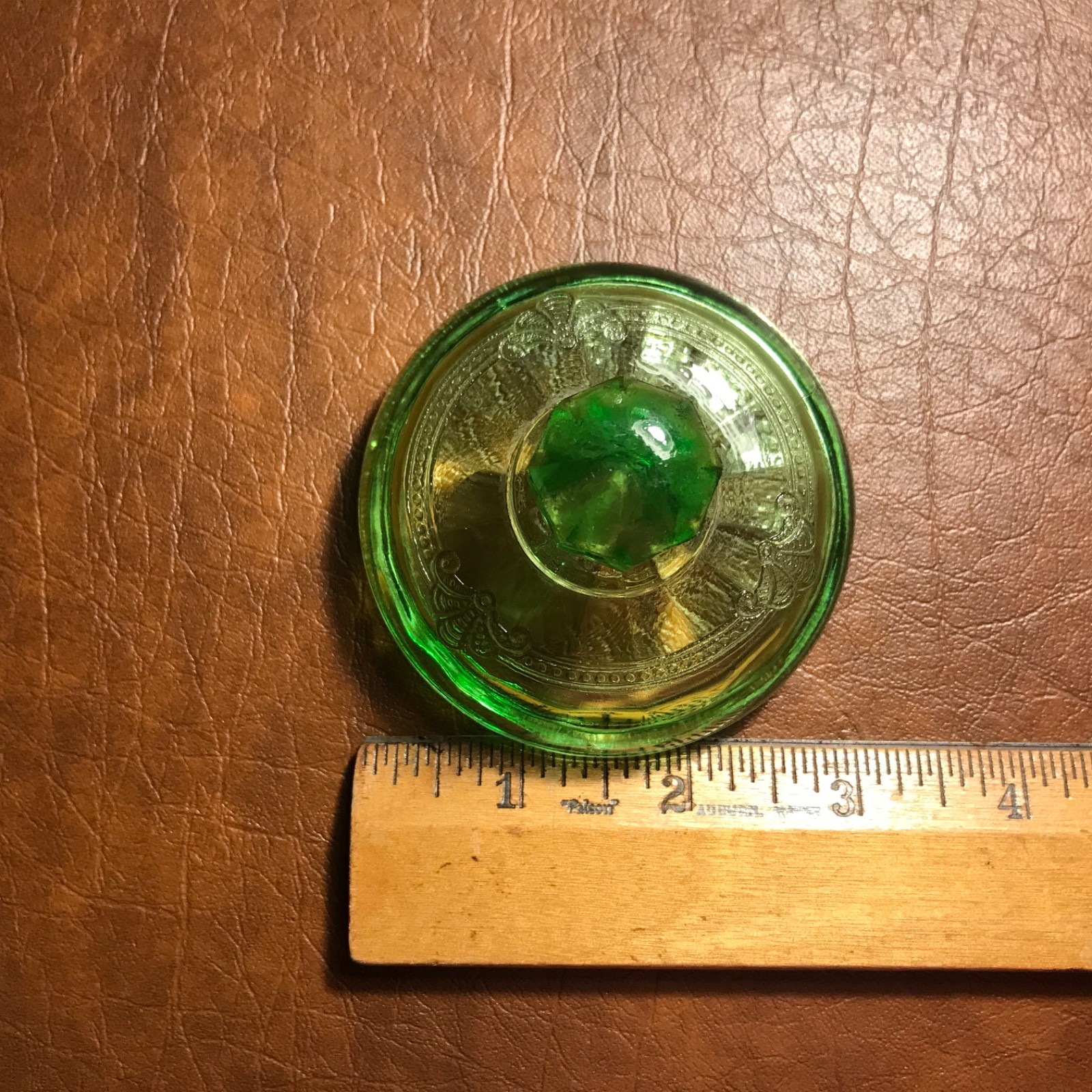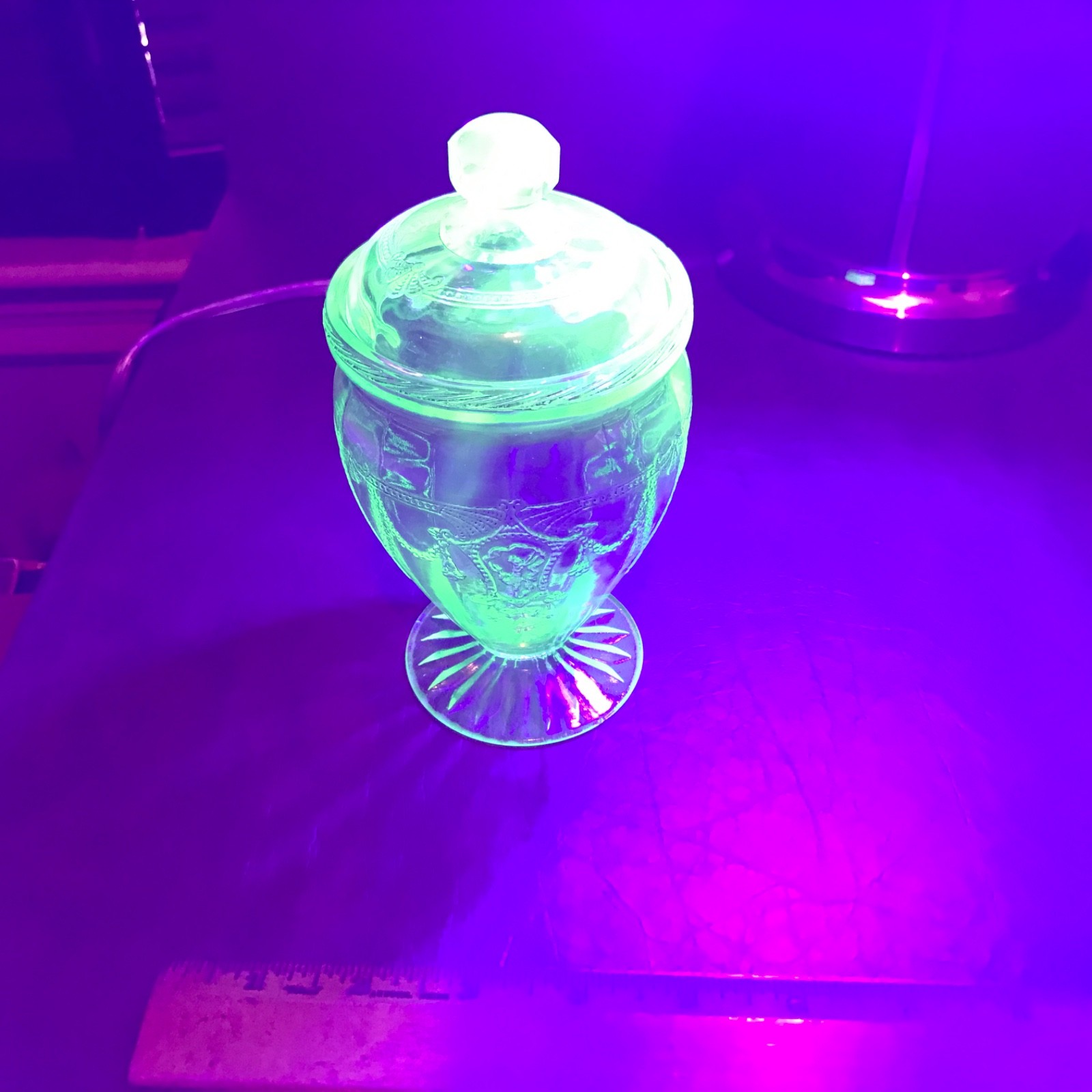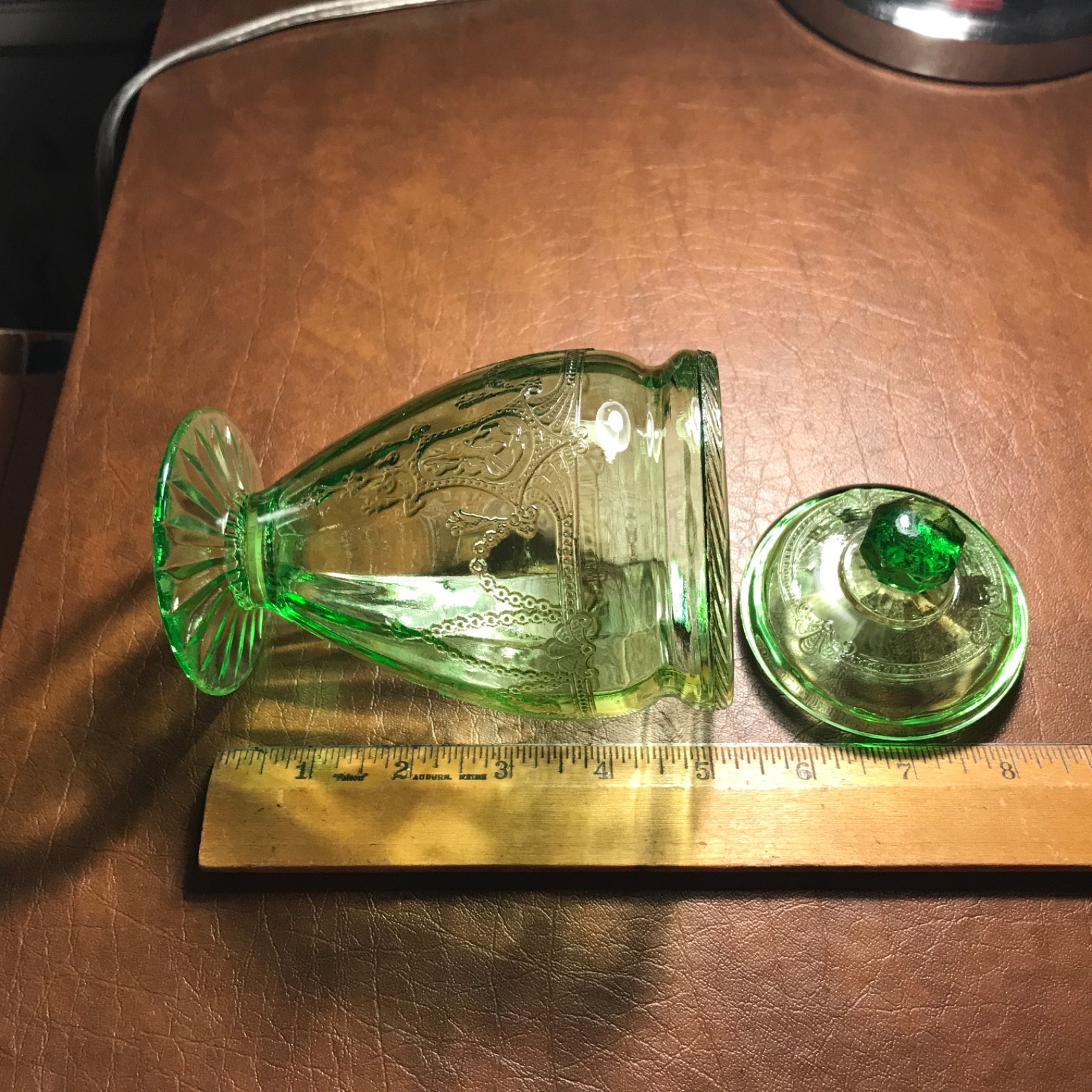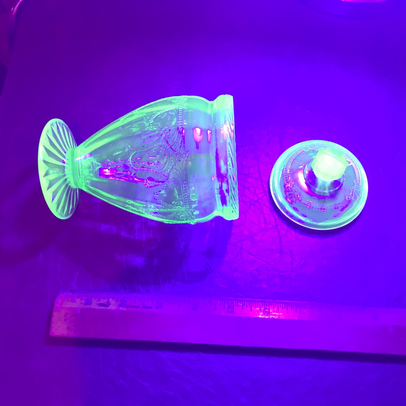 Listing a super rare 6 1/2 Inch Tall Cameo Ballerina Candy Dish in great shape. It is 6 1/2 inches tall and 3 3/4 inches in diameter. The base is 5 inches tall. It appears to have never been used. It glows beautifully under the black light! There are no scratches, wear or damage to the item. The only thing detrimental that I could find is a small design flaw on the top lip of the base (picture shows it but it is real hard to see.) It is NOT a chip. The top lip has the rope design. The Lid is in perfect shape. This is from our personal collection and was always on display only. I am listing a number of pieces this week from the same pattern. Feel free to ask any questions and I will get back to you with an answer. Thank you for viewing.