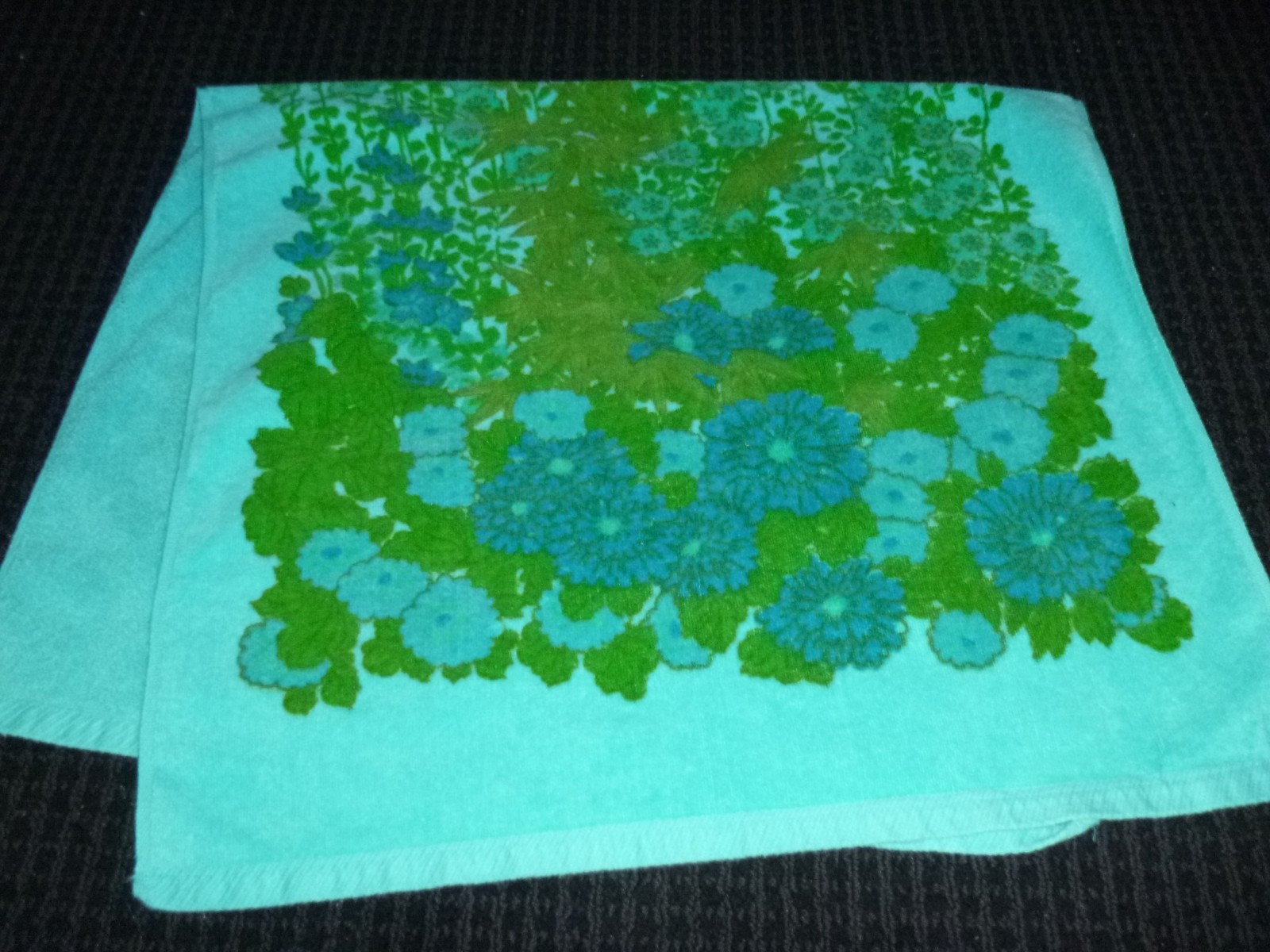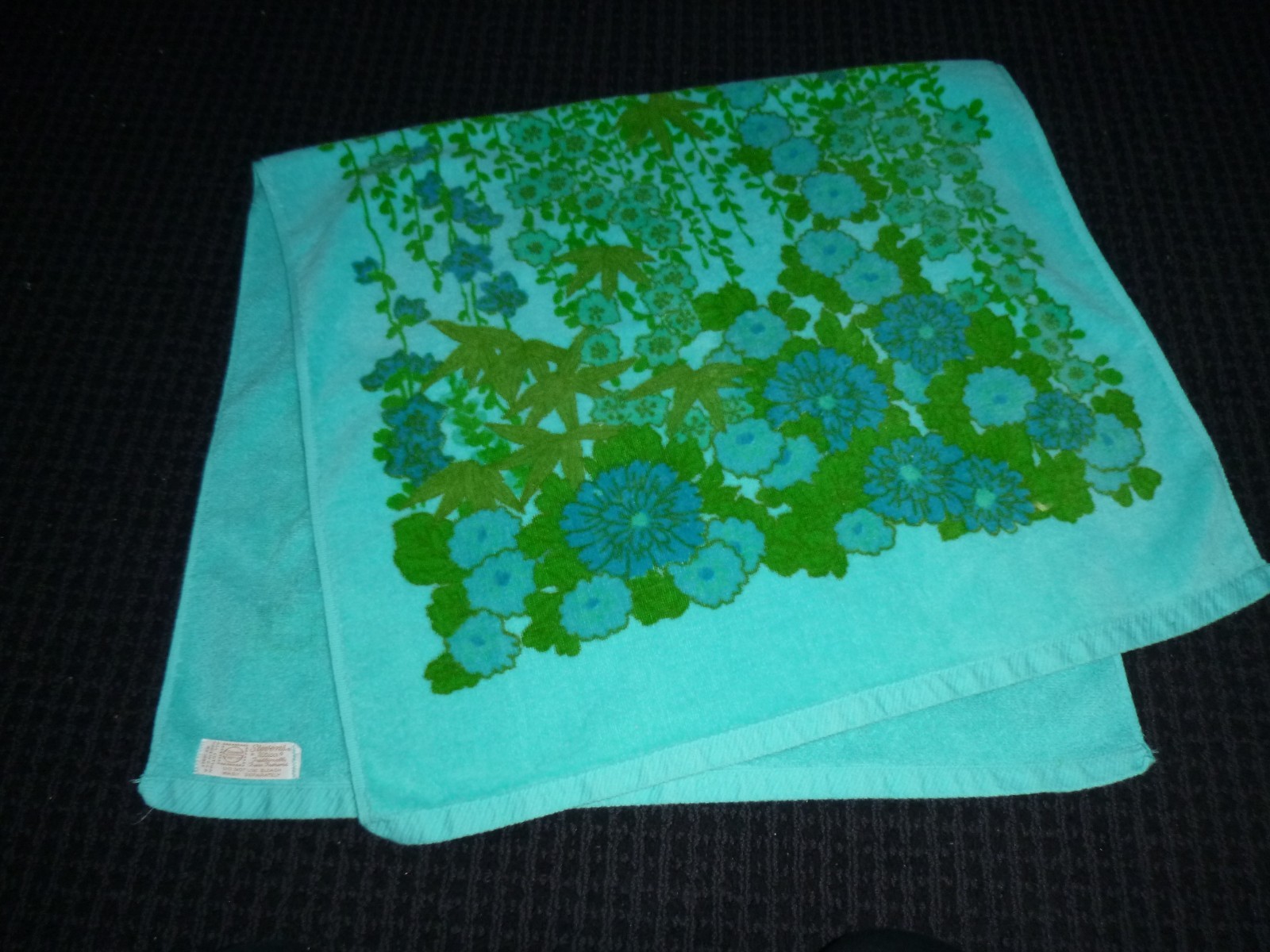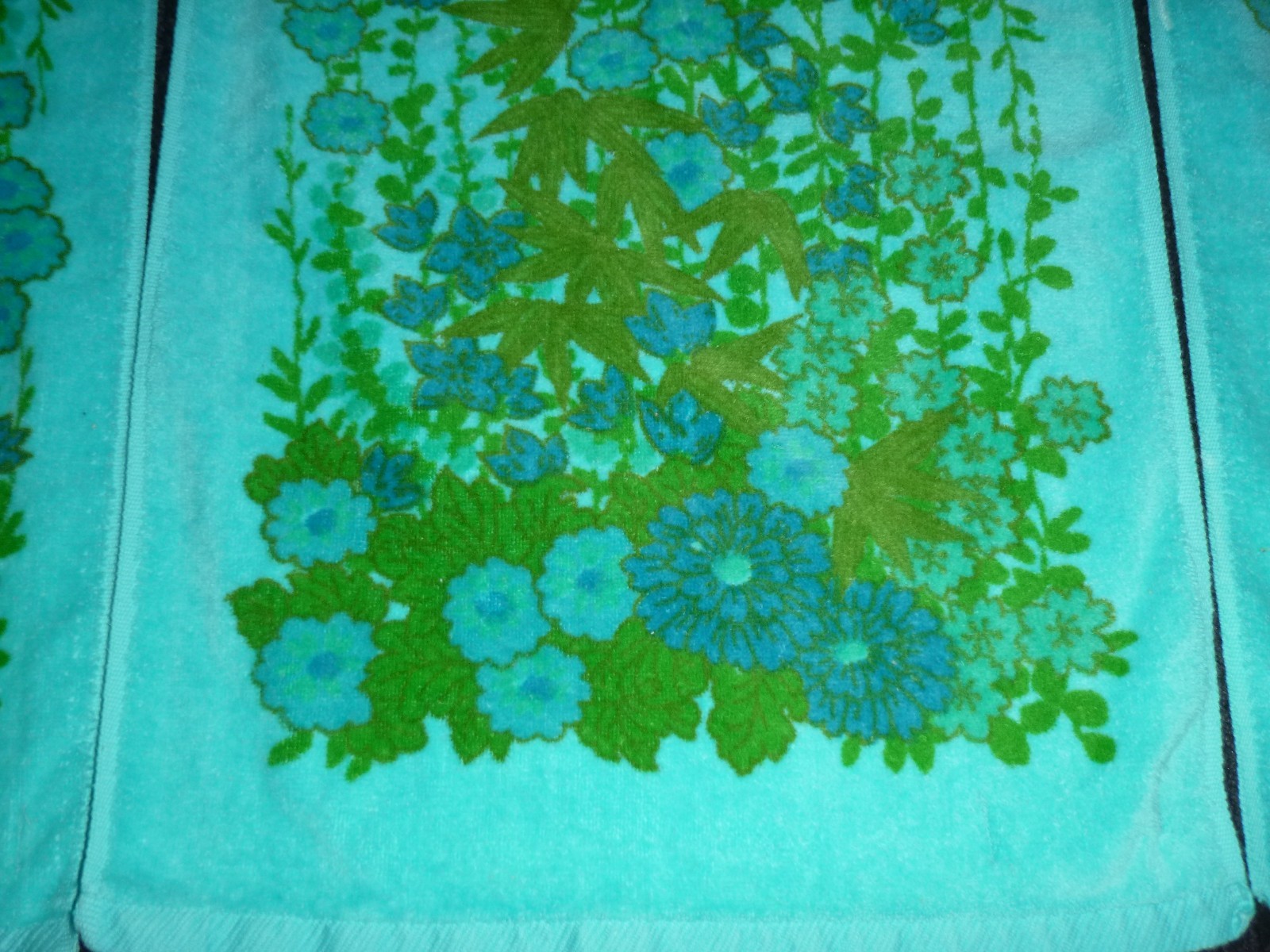 Oohhhh....such a pretty towel set! Vintage 60s / 70s soft and plush 6 piece towels set by Utica Stevens. Gorgeous turquoise with a printed flower power design in greens and blues. This set of 6 includes the following:1 bath towel - 24x40"3 hand Towels - 16x25"2 washcloths - 12.5x11.5" (slightly faded)