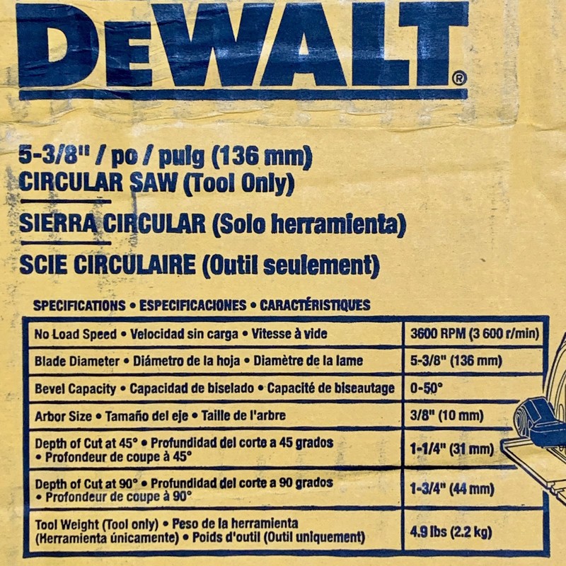size allows for a maximum 1-3/4 in. depth of cut at 90 degrees and a maximum 1-1/4 in. depth of cut at 45 degrees•ADJUSTABLE BEVEL CAPACITY from 0-50 degrees using the tool-free bevel lever•CONVENIENT STORAGE on the jobsite with built-in rafter hook•SAFELY AVOID ACCIDENTAL CUTS with brake that rapidly stops the blade when the trigger is released•BRIGHTEN DARK WORK AREAS with on-board LED for enhanced visibility and cut accuracy•DUST CHUTE ADAPTABLE: Works with DEWALT AirLocksystem or an optional, standard 32 mm dust extractor to minimize excess dust during cutting (system and extractor sold separately)•DEWALT 12V MAX COMPATIBILITY: Works with all brand 12V MAX batteries (battery sold separately) •Arbor Size [in]: 3/8•Battery Type: Lithium Ion•Bevel Capacity [deg]: 50 degrees•Blade Diameter [in]: 5-3/8•Has LED Light?: Yes•Is Battery Included?: No•Max. Depth of Cut at 45 degrees [in]: 1-1/4•Max. Depth of Cut at 90 degrees [in]: 1-3/4•Power Source: Cordless•Product Height [in]: 8.32•Product Length [in]: 15.69•Product Width [in]: 7.03•Voltage [V]: 12 Includes Dewalt warranty. For complete warranty details visit the manufacturer website at dewalt.com. WARNING: Some dust created by power sanding, sawing, grinding, drilling, and other construction activities contains chemicals known to the State of California to cause cancer, birth defects or other reproductive harm. Some examples of these chemicals are: • lead from lead-based paints, • crystalline silica from bricks and cement and other masonry products, and • arsenic and chromium from chemically-treated lumber. Your risk from these exposures varies, depending on how often you do this type of work. To reduce your exposure to these chemicals: work in a well ventilated area, and work with approved safety equipment, such as those dust masks that are specially designed to filter out microscopic particles. www.P65Warnings.ca.gov Shipping Policies All orders received up to 7:59 AM Eastern Time ship same business day via a standard ground service 1 – 6 business days (transit time). You will automatically receive a tracking number when the order is processed. Contact Us Our service hours are Monday - Friday 9:00AM - 5:00PM Eastern Time. For service please use the 'Ask A Question' tab at the top of our listing details. Our goal is to answer your email within 24 business hours Monday - Friday. We strive to answer all emails that come in over the weekend by the end of business day on Monday. Address: 11820 Uradco Place, Suite 104, San Antonio, FL 33576 Return Policy You may return your order within 30 days of receipt for a complete refund minus our average shipping cost to your zone if this listing for for free shipping. You are responsible for the return shipping cost. The item must be unused, in the original packaging, and include all
