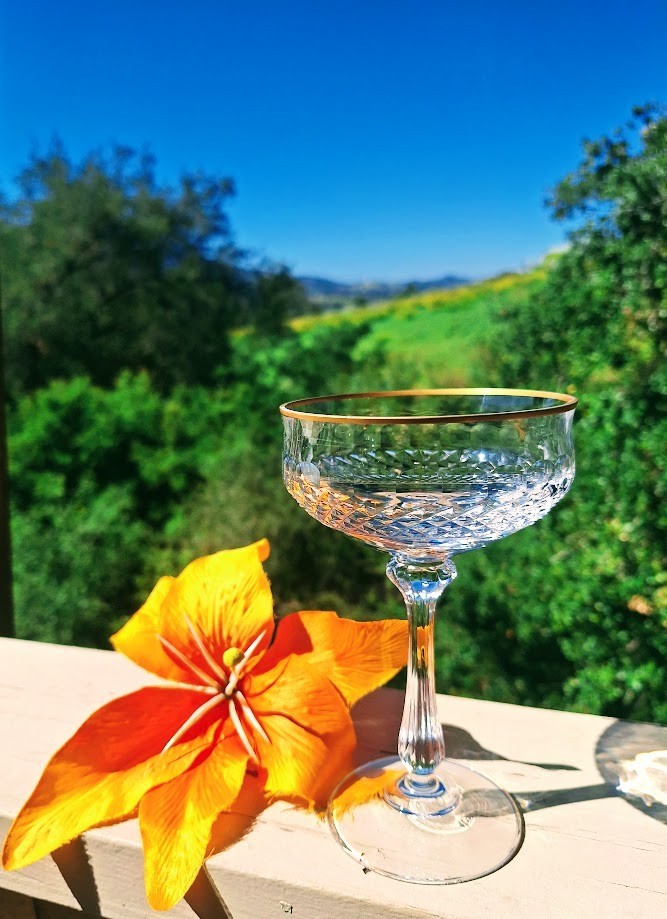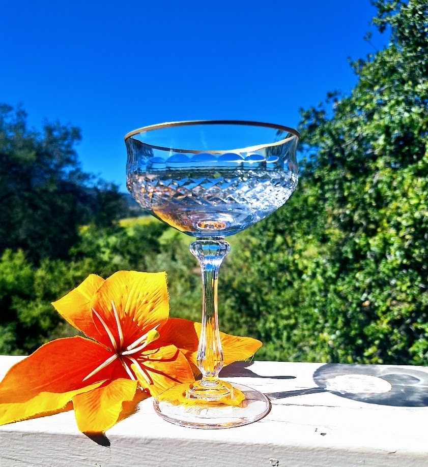 Champagne Tall Sherbet Glass Gold Crown by Mikasa The blown glass pattern has an adorable gold brim. The ribbed stem further highlights the elegance of these glasses. Blown glass. Elegant barware for your next celebration toast or special cocktail night. Give them a little thump and they really sing.The Mikasa Gold Crown crystal pattern, which includes the Champagne/Tall Sherbet glass, was produced between 1983 and 1987. This pattern is now discontinued. It stands approx.: 6” tall x 3.75” Width Excellent condition, no chips, cracks, or visible signs of damages. None of the gold trim is missing on the glasses.