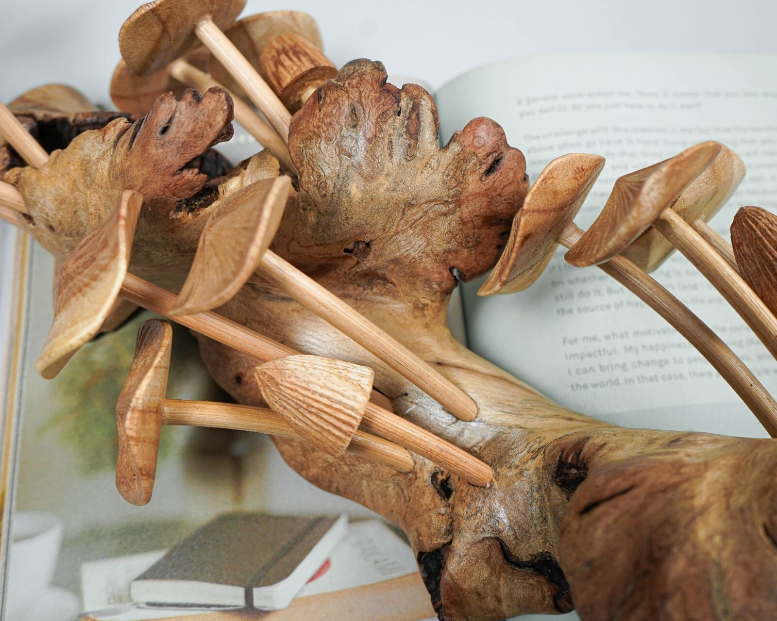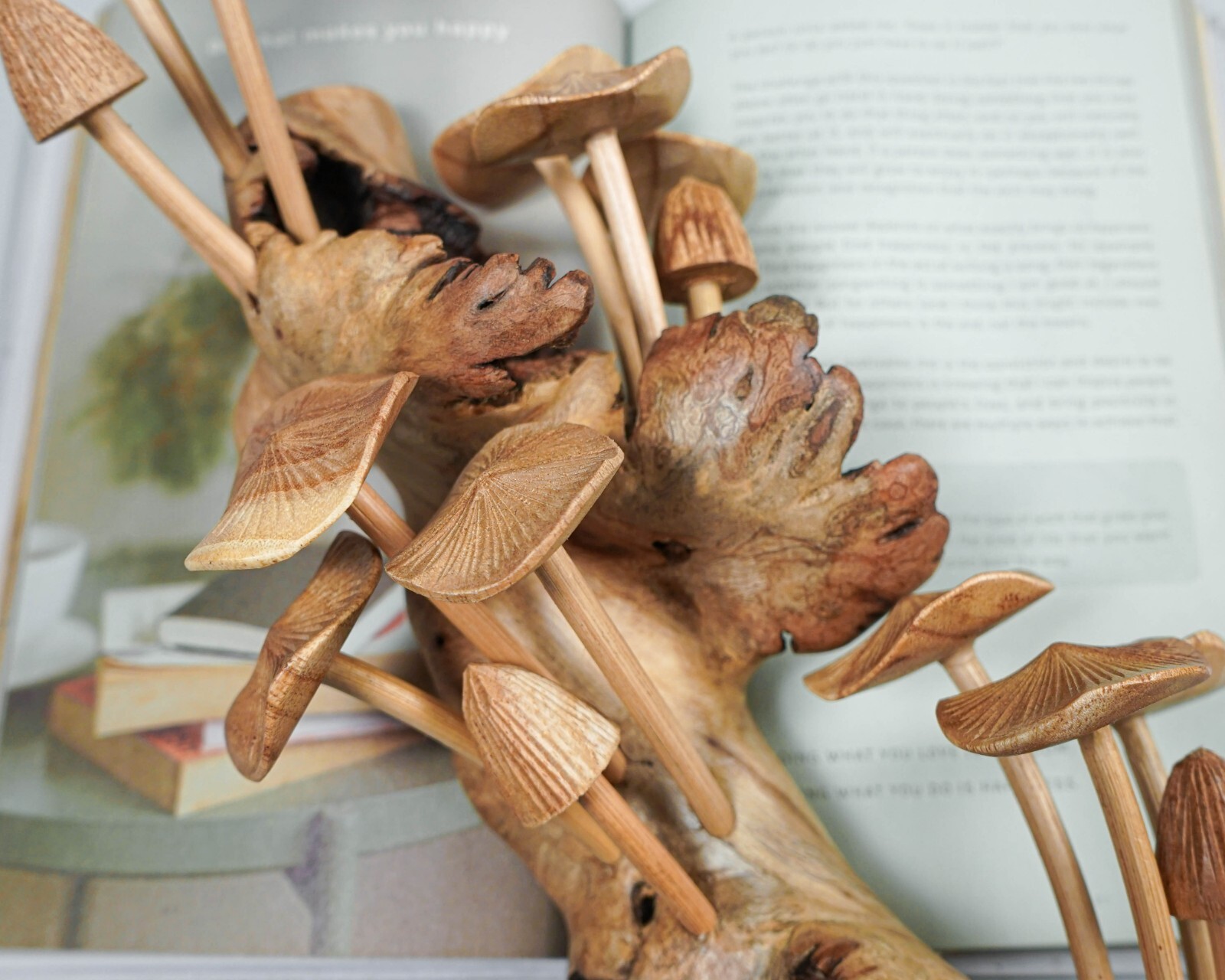 Mushroom is made from local wood, Jempinis wood. Part of the base of this statue is made of Parasite wood. Parasite wood is a very unique type of wood.Parasite wood is formed as a defense mechanism by a host tree overgrown by a parasite. This defense grows into unique wood called parasite wood. Back then, this wood was only used as firewood, but our skilled artists create beautiful art from it.As the finishing touch, we choose to use a clear coat , to maintain the natural
