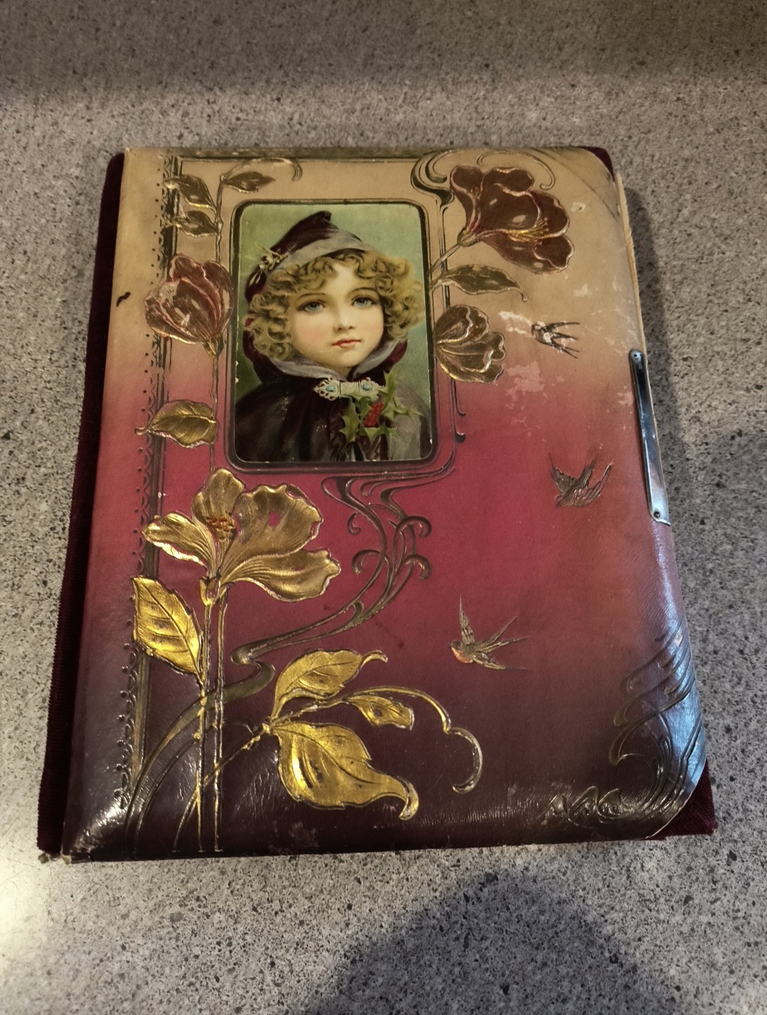 This antique Victorian photo album features a young girl on the cover, with dimensions of 10.5" x 8.5" x 2". originates from the United States during the Victorian era, making it a unique and nostalgic collectible item for those interested in photographic history. Holds 28 4x6 and 16 wallet sized. Some pages have torn borders.